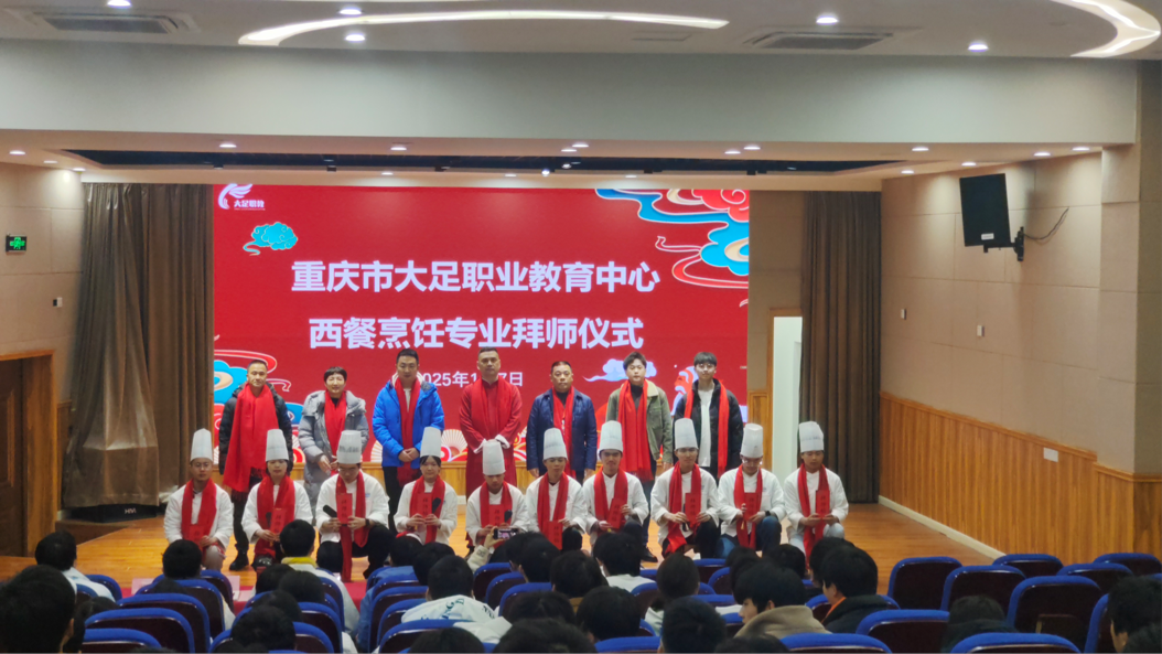 为弘扬源远流长的中华传统文化,传承精湛的烹饪技艺之道,重庆市大足职业教育中心于2025年1月7日上午在第二学术报告厅举行2023级西餐烹饪专业拜师仪式。本次活动旨在构建和谐的师徒关系,搭建技艺交流的平台,提升烹饪专业学生的技艺水平,共同推动烹饪行业的繁荣发展。