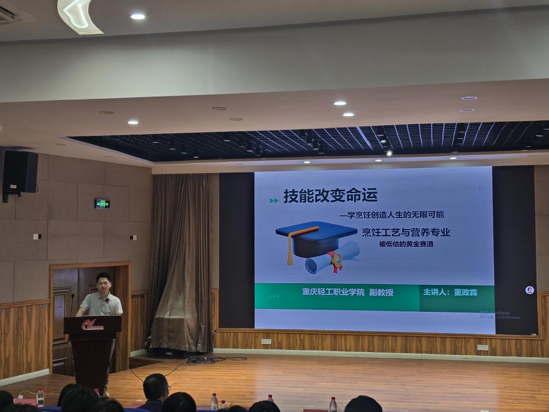 活动伊始,重庆轻工职业学院董政霖老师以“技能改变命运——学烹饪创造人生的无限可能(烹饪专业被低估的黄金赛道)”为题举办主题讲座。董老师结合行业发展趋势与学生成长案例,深入剖析了烹饪职业的多元价值:“烹饪不仅是一门手艺,更是连接文化、传递温度的桥梁。随着餐饮行业的升级,具备专业技能的烹饪人才正成为市场‘香饽饽’。”这番深入浅出的分享,让在场学生对专业前景有了更清晰的认知