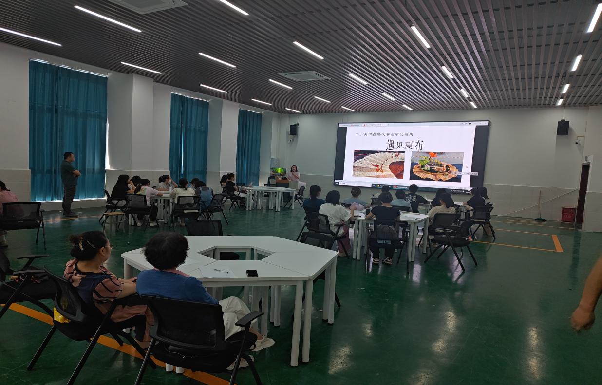 当日9:30,培训以一场专题讲座拉开序幕。重庆市商务职业学院秦彩凤副教授在精工楼一楼模拟导游实训室,以“职业技能竞赛视角下的美学与餐饮创意应用”为题展开分享。秦教授结合自身参赛经验,从“各级各类大赛现状与分析”“美学在餐饮创意中的应用”“大赛对教师与选手的挑战与要求”等五个维度,通过典型案例与数据,系统阐述了竞赛导向下教学创新的实践策略。讲座中,她强调美学对餐饮创意的赋能作用,并针对教师如何提升指导能力、选手如何适应竞赛标准提出具体建议,现场互动热烈,收获教师一致好评。