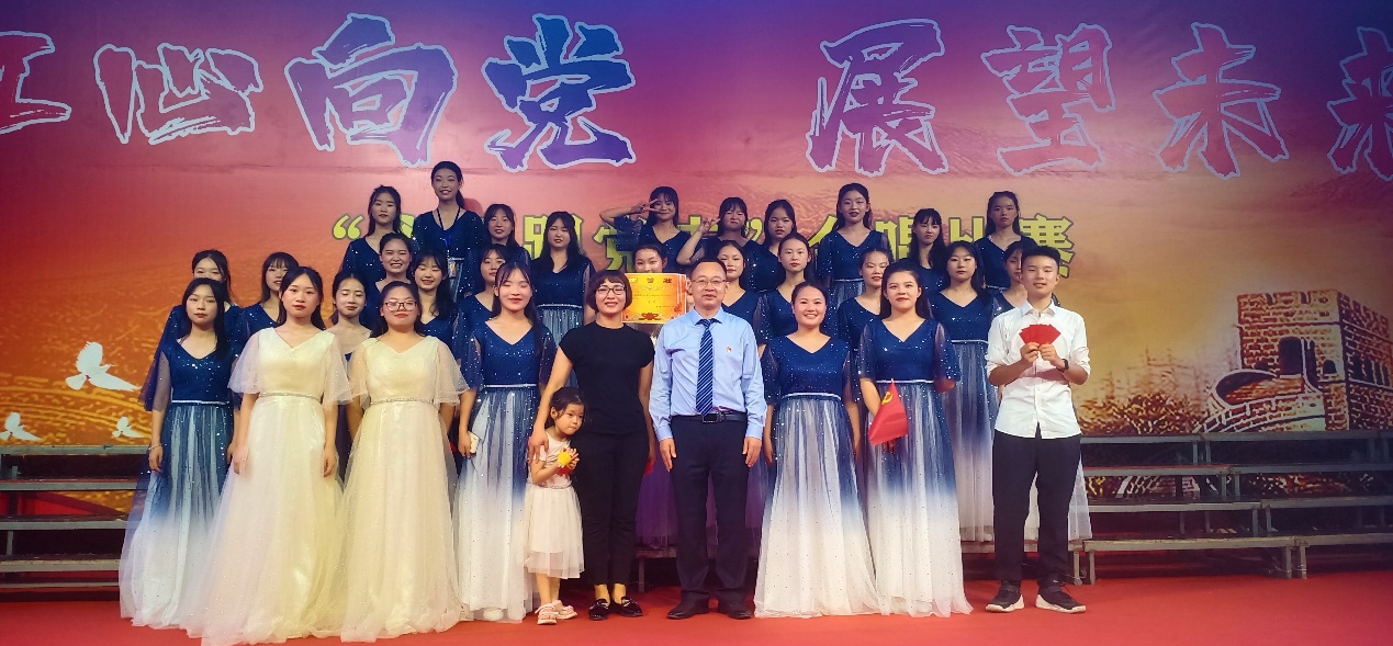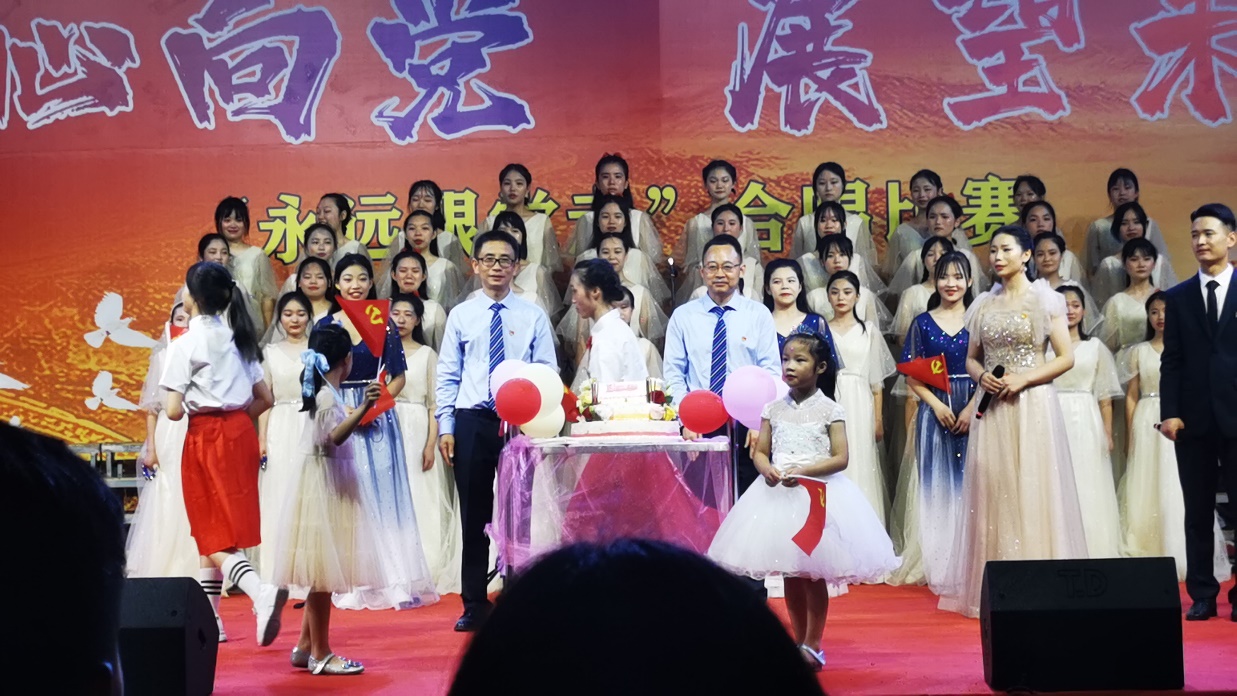 演出临近结束,师生们用各种方式庆祝党的生日,表达爱党爱国之心,如特邀小嘉宾为党的生日献上生日蛋糕,学校分管德育工作的覃书记传递党旗。最后,主持人公布获奖名单,学校领导为获奖班级颁奖,合影留恋。