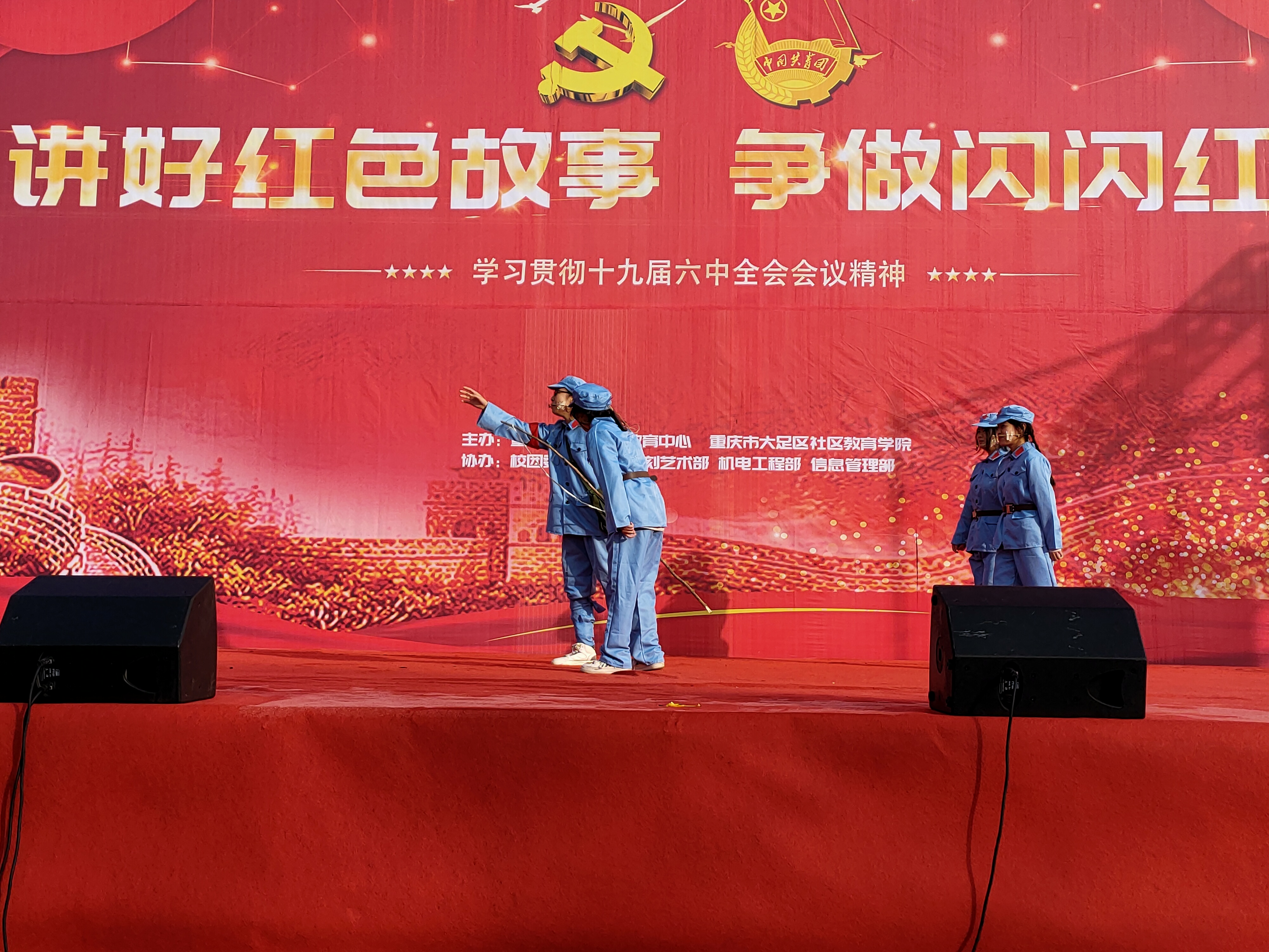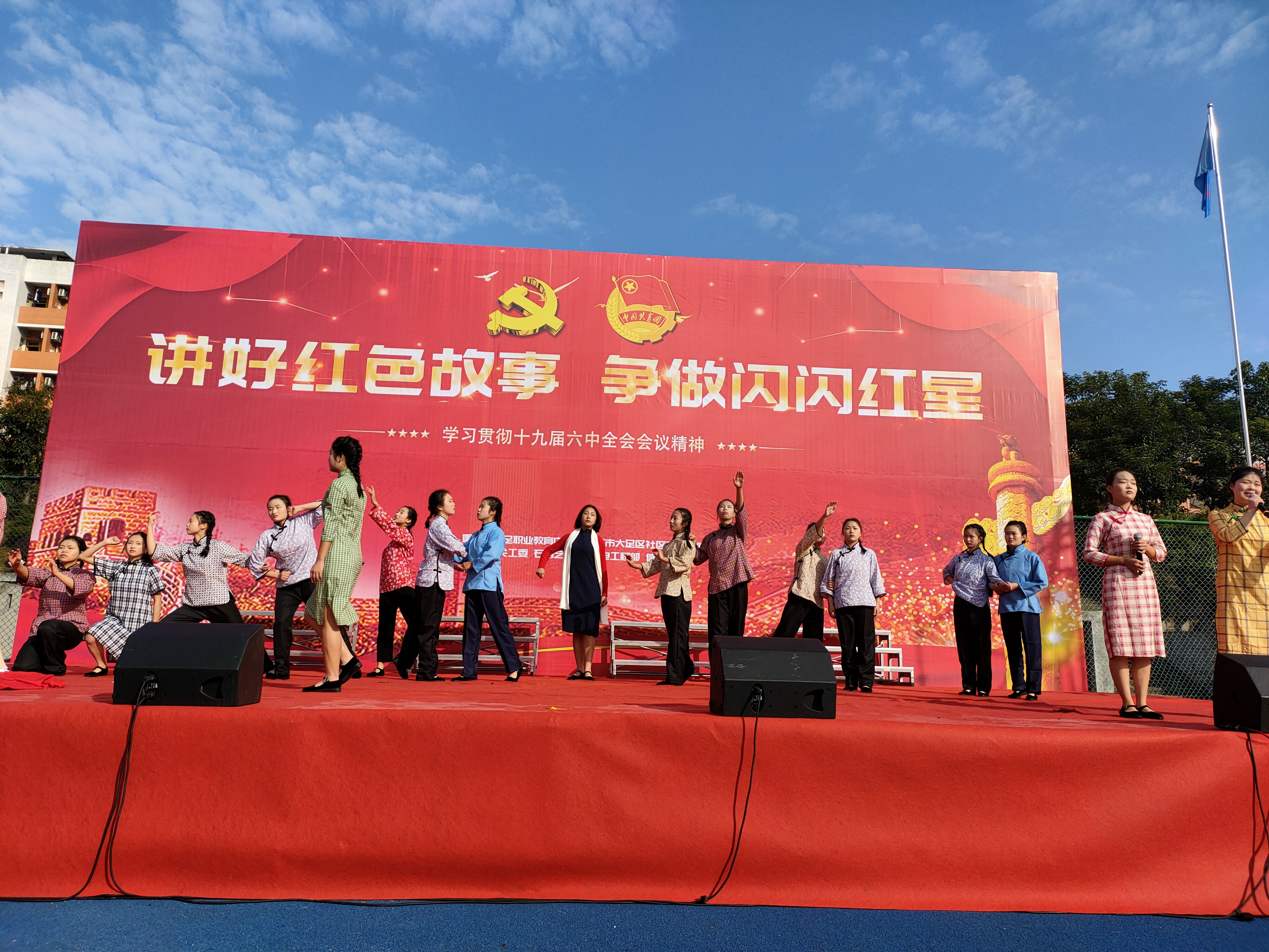 在全校掀起学习贯彻落实十九届六中全会精神之际20211130职教中心石刻艺术部在足球场讲好红色故事,争做闪闪红星为主题举行红色故事演绎展演活动。石刻艺术部全体师生观看了演出。