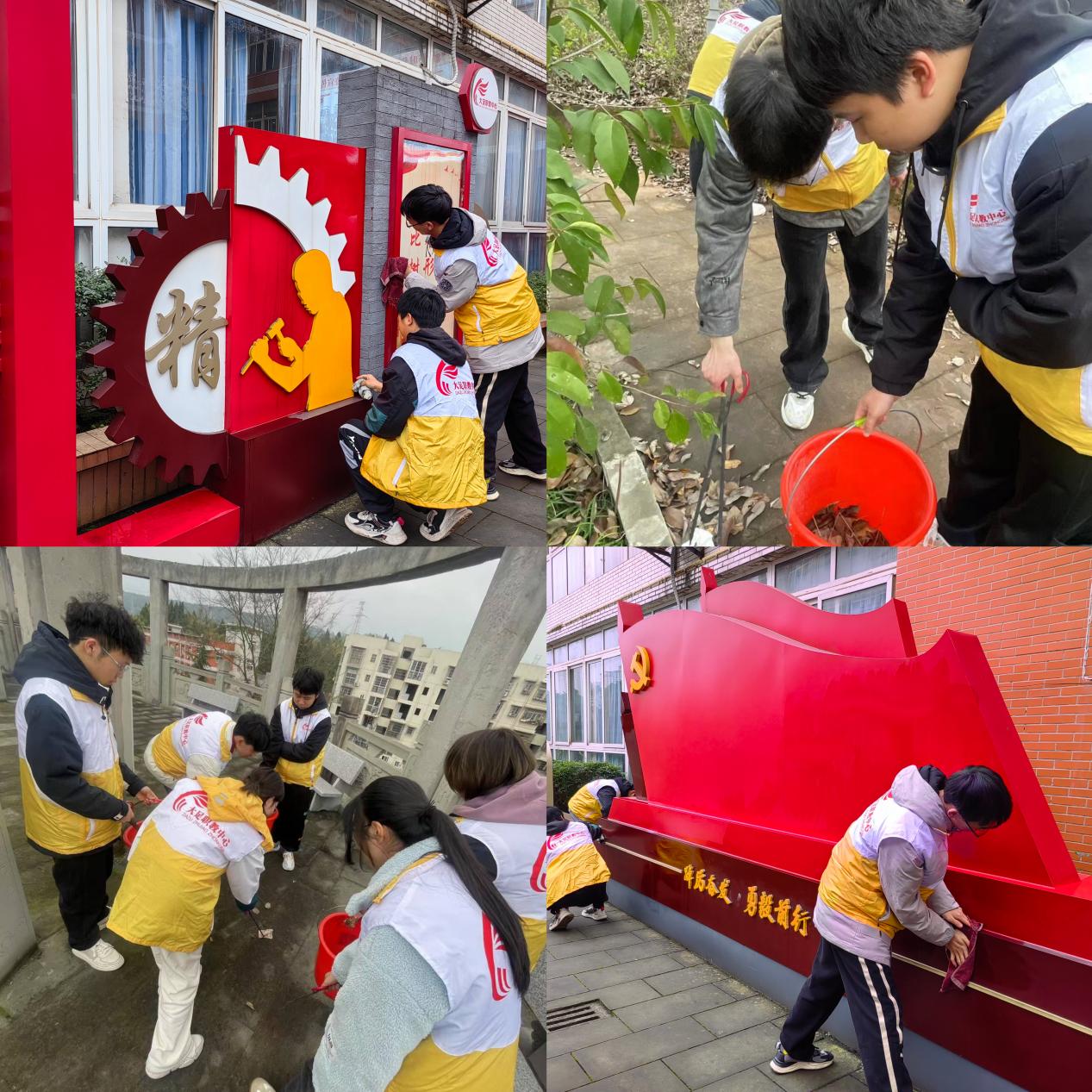 校园清扫志愿服务。志愿者同学在校团委干事的带领下自带卫生工具,开展校园清扫志愿服务。志愿者们充分发挥不怕脏、不怕累的精神,认真打扫,清理垃圾,还校园一片干净清洁,用实际行动诠释了雷锋精神的真谛,展现了大足职教学子良好的精神风貌。