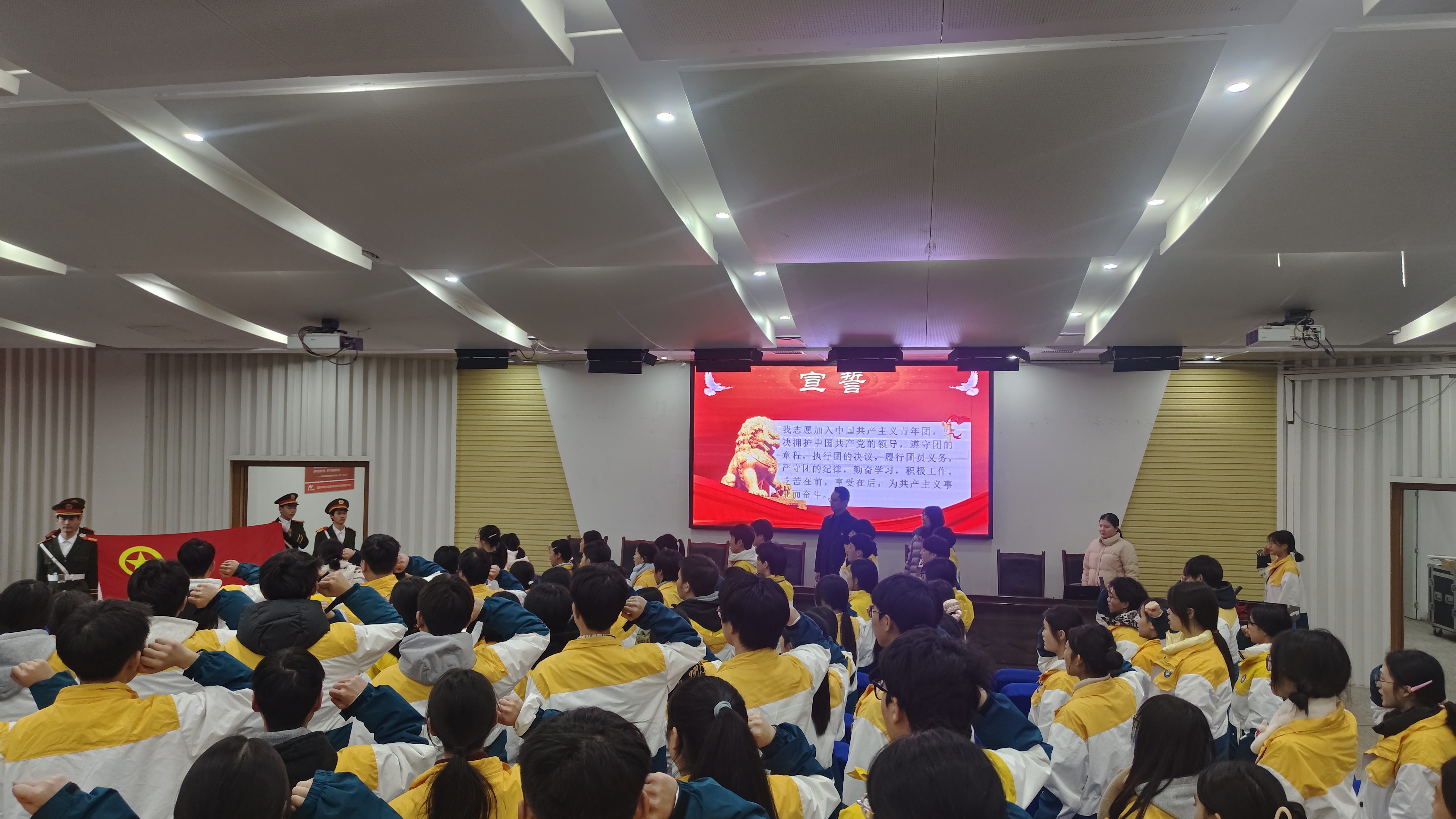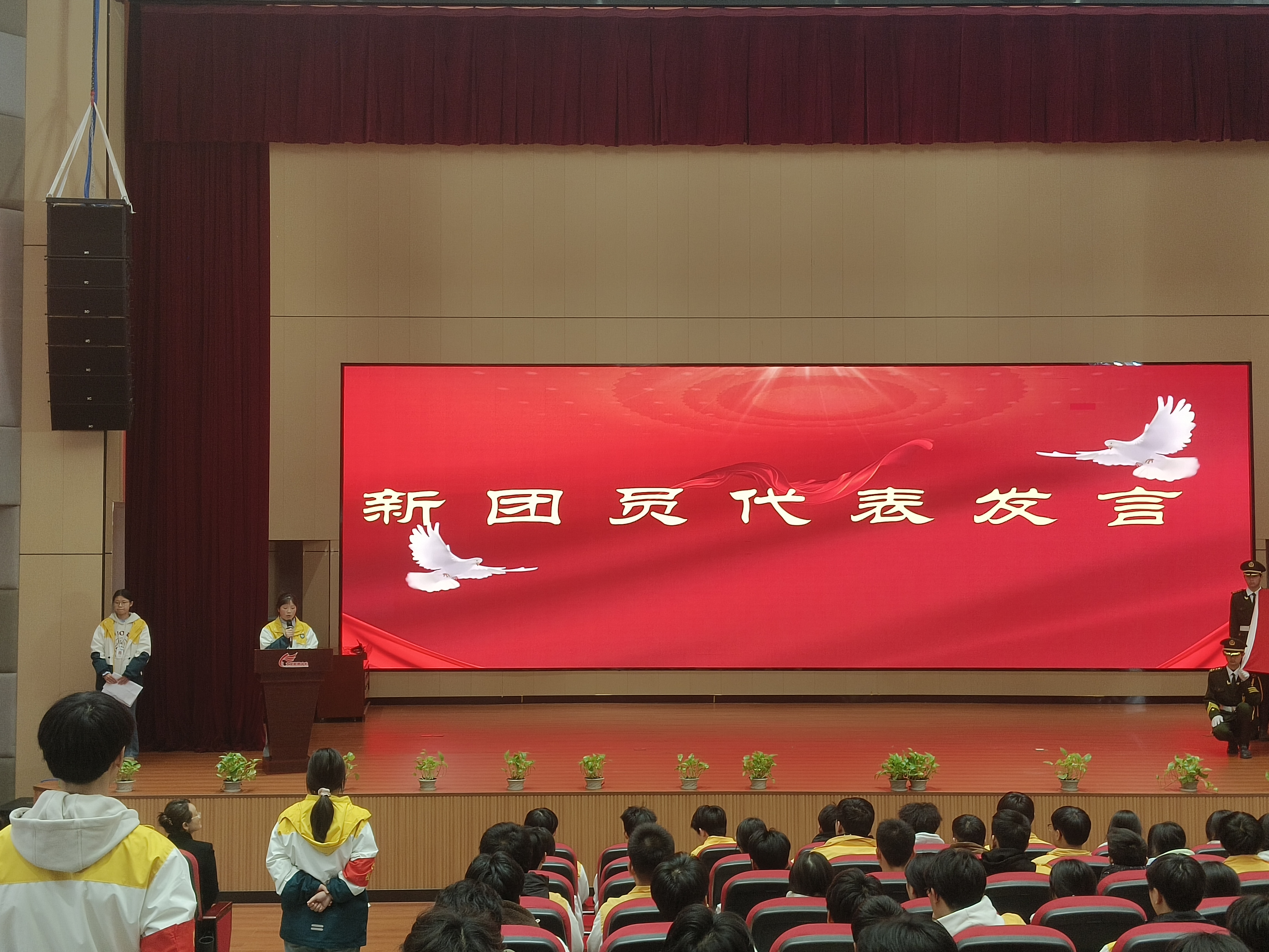 新团员代表钟露和杨丹同学分别在各自的会场主席台上发言。发言介绍了共青团的性质、使命及重要作用;承诺将恪守团员标准、传承优良传统,在学习中勤奋精进、全面发展;在社会中服务他人、担当责任,以实际行动诠释团员的光荣使命。发言激动人心,参会青年报以热烈掌声。