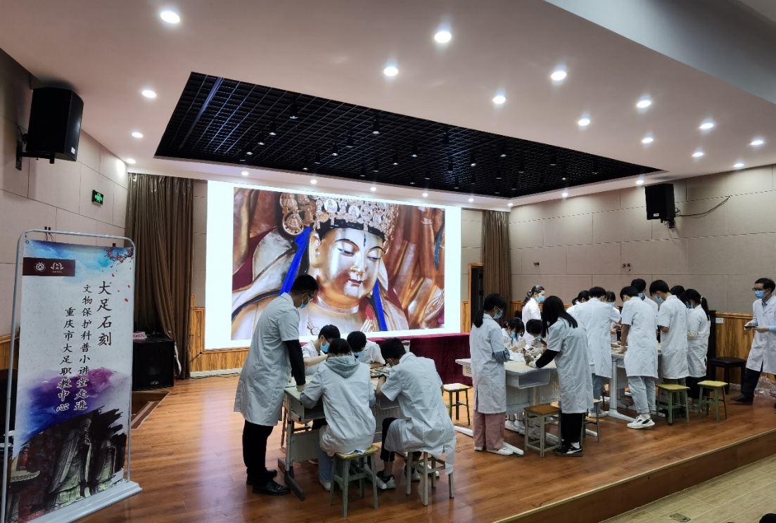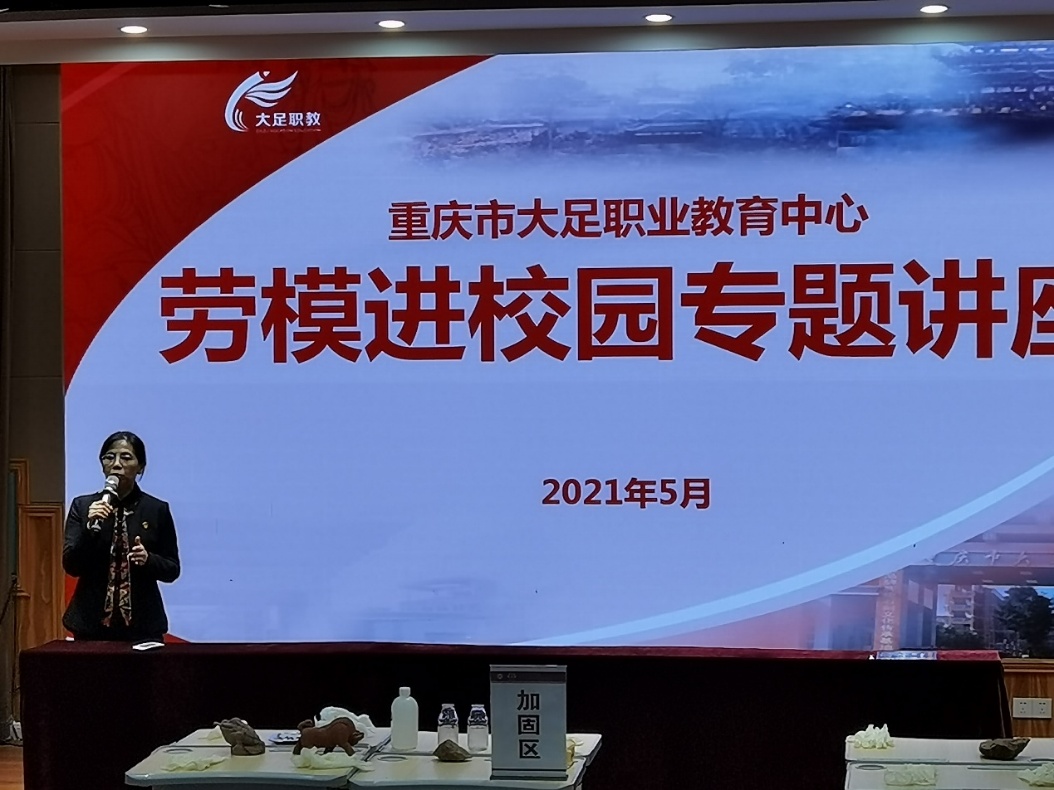 为深入推进党史学习教育,大力弘扬劳模工匠精神,激励学生崇尚先进、学习先进、争当先进,努力成长成才,5月26日,职教中心特请大足石刻研究院文物保护工程中心主任、全国劳动模范陈卉丽到校举办劳模进校园专题讲座,讲授大足石刻文物保护的重要性和相关知识,并现场教授石刻文物的修复技巧。