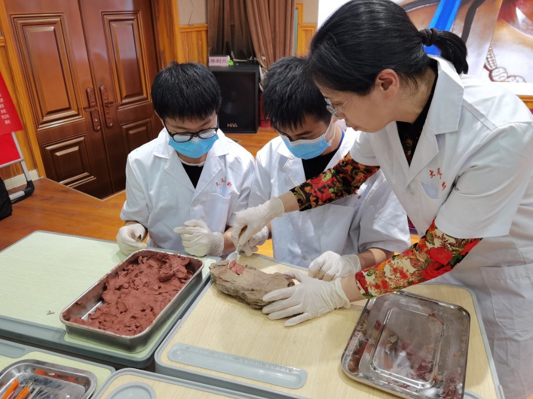 讲座结束后,陈卉丽现场邀请10余名学生代表上台,让他们换上“白大褂”,并和其他修复人员一起现场指导石刻文物修复中的“补型”“加固”“清洁”等工作。