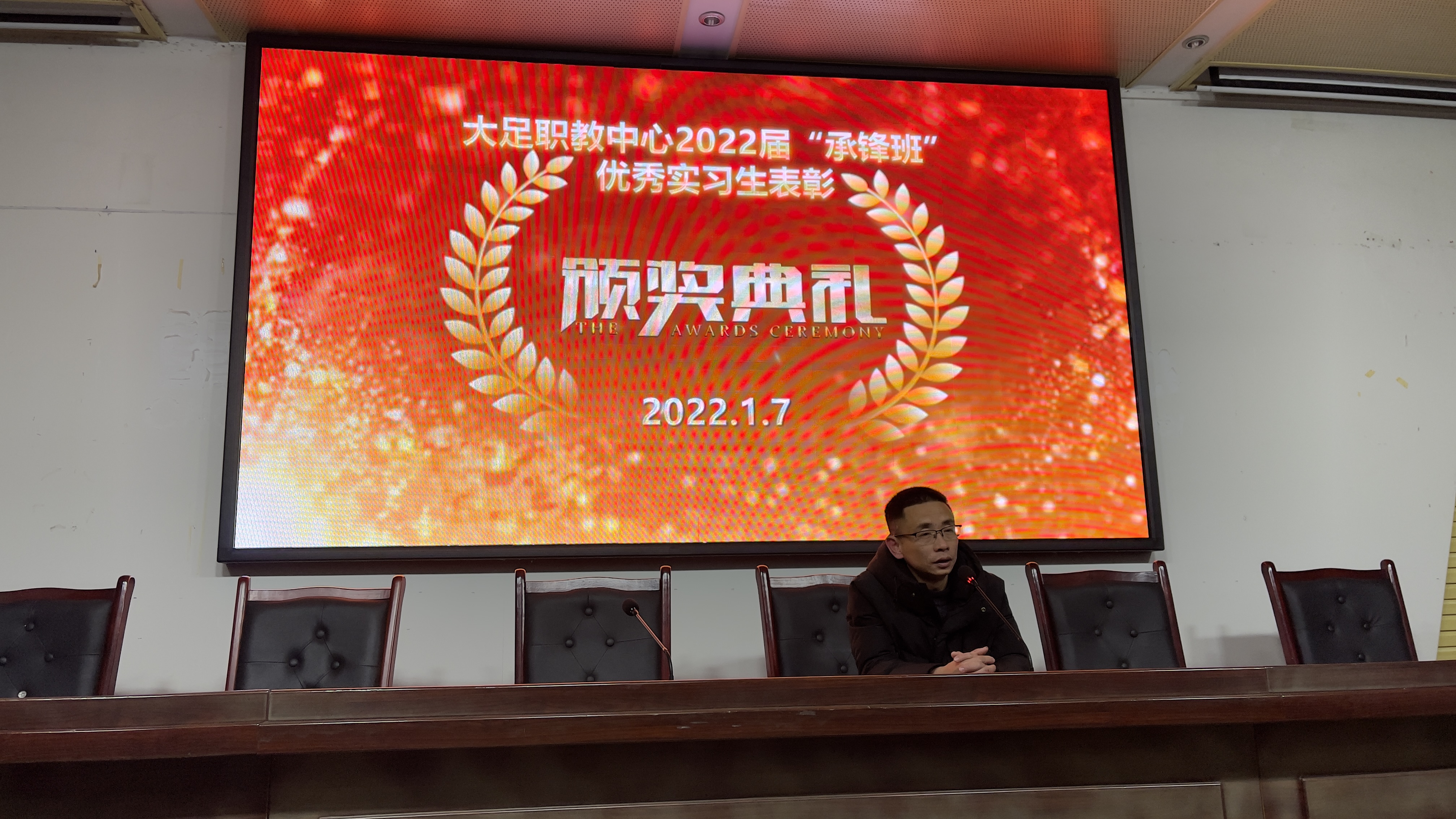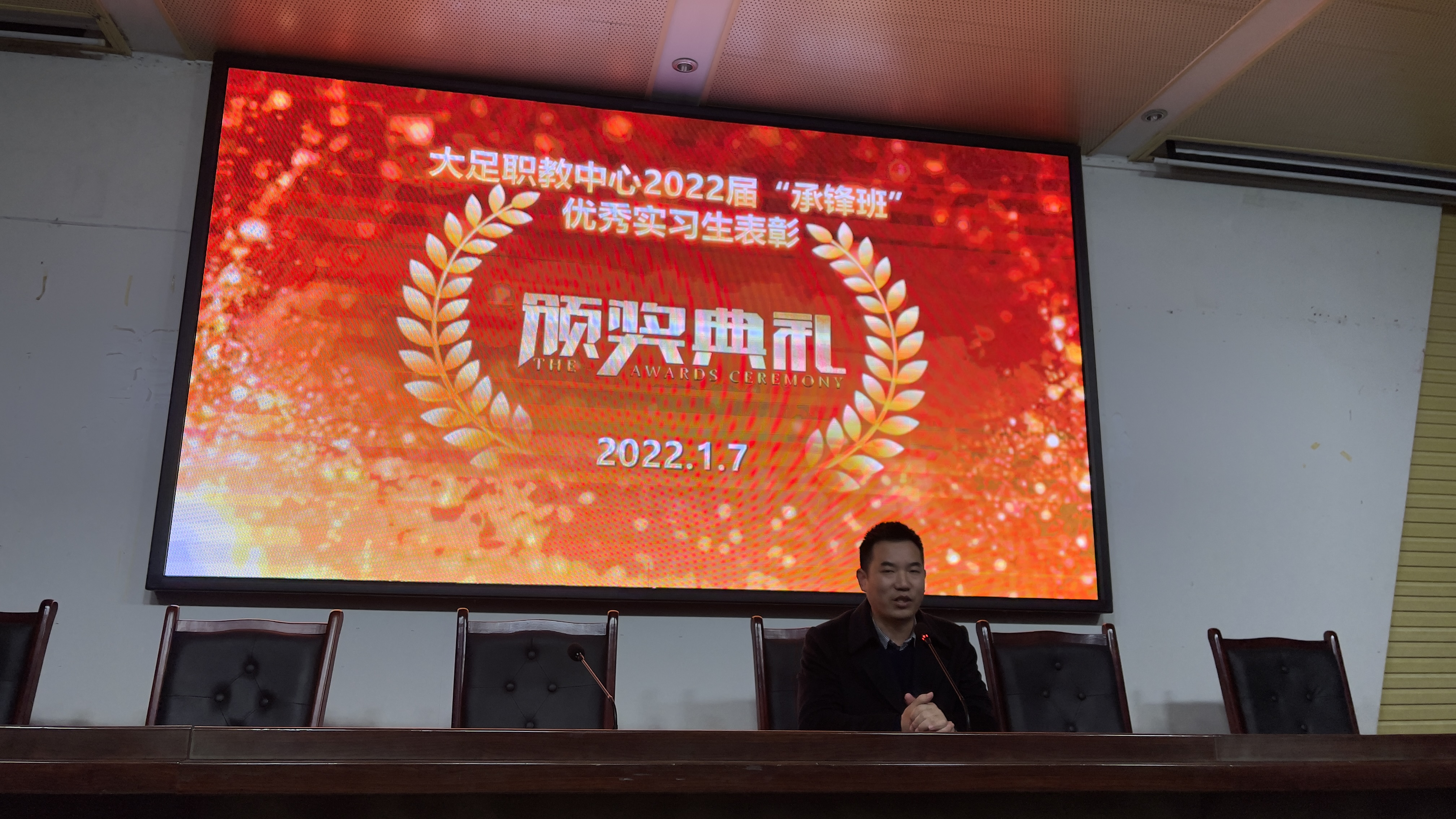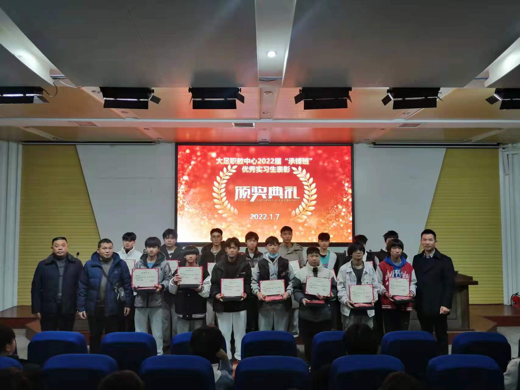 2022年1月7日,职教中心2020级“承锋班”学生实习工作总结暨表彰大会在学校第一学术报告厅举行,学校党委委员、副校长封吉泉,承锋集团董事长黄军学,机电工程部部长李再明、副部长粟廷富及带队老师谢永强出席会议。2020级承锋班50余名实习学生参加会议。
