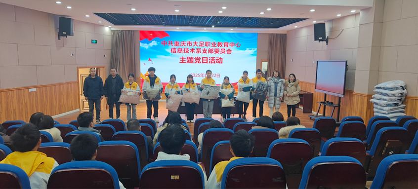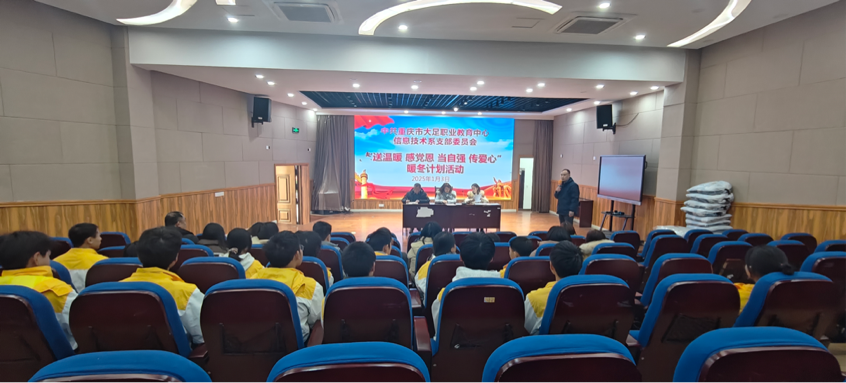 2025年1月3日,重庆市大足职业教育中心信息技术系党支部在第二学术报告厅成功举办了“暖冬计划”活动,旨在为家庭困难但学业表现优异的学子送去冬季保暖衣物和床上用品,帮助他们温暖过冬。此次活动是该支部1月主题党日活动的重要活动之一,得到了联系领导学校党委委员、副校长彭冬梅同志的大力支持和全系党员同志的积极响应。
