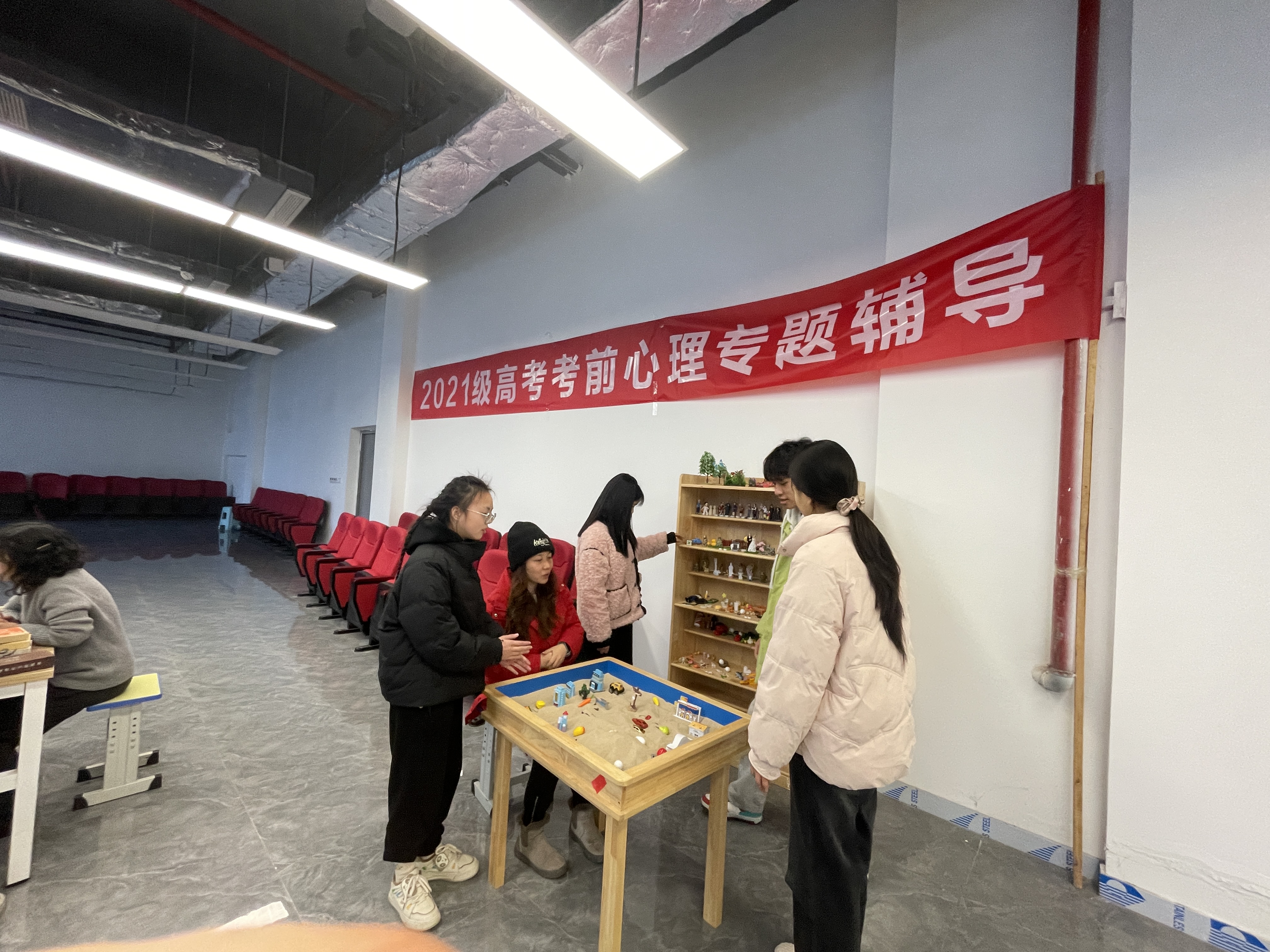 此次辅导活动在高新校区心理健康中心举行,活动主要以现场咨询的形式开展。在活动过程中,四位心理老师利用沙盘、卡牌、心理绘画等开展现场心理咨询,从认知调整、备考及压力放松小技巧对学生进行了现场辅导,帮助同学们建立合理认知,调适不良心态,掌握一些实用考前放松小技巧。最后,四位心理老师鼓励同学们保持阳光心态,从容迎接高考,并预祝同学们高考顺利!