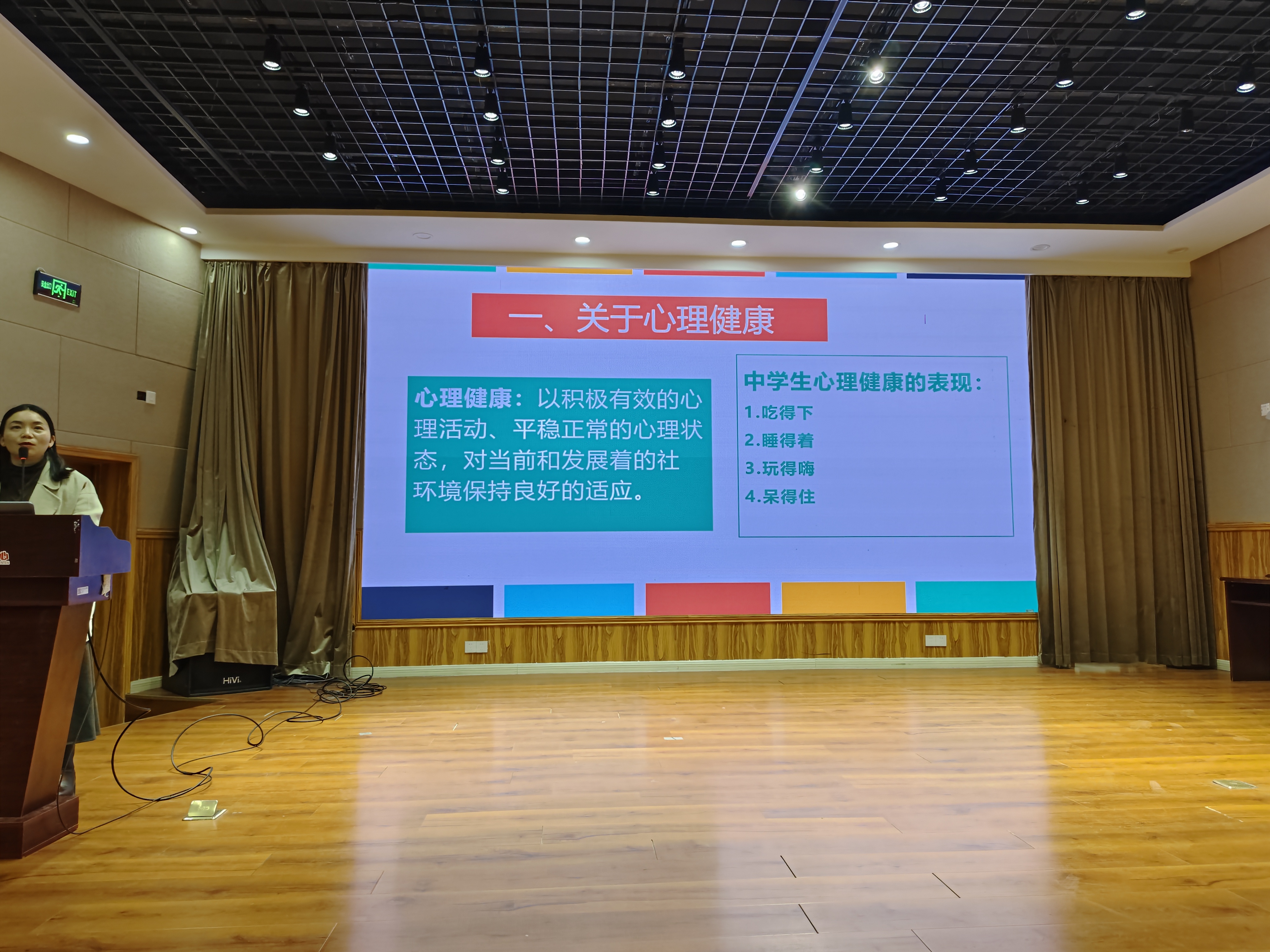 张老师首先从心理健康的定义入手,中学生心理健康的行为表现:吃得下、睡得香、玩得嗨、呆得住四个方面结合同学们的学习生活实际,教会同学们了解评估自己的心理健康状况,引导同学们看待心理困扰和疾病,发现问题及时干预、干预求助,消除同学们对心理问题的污名化和病耻感。