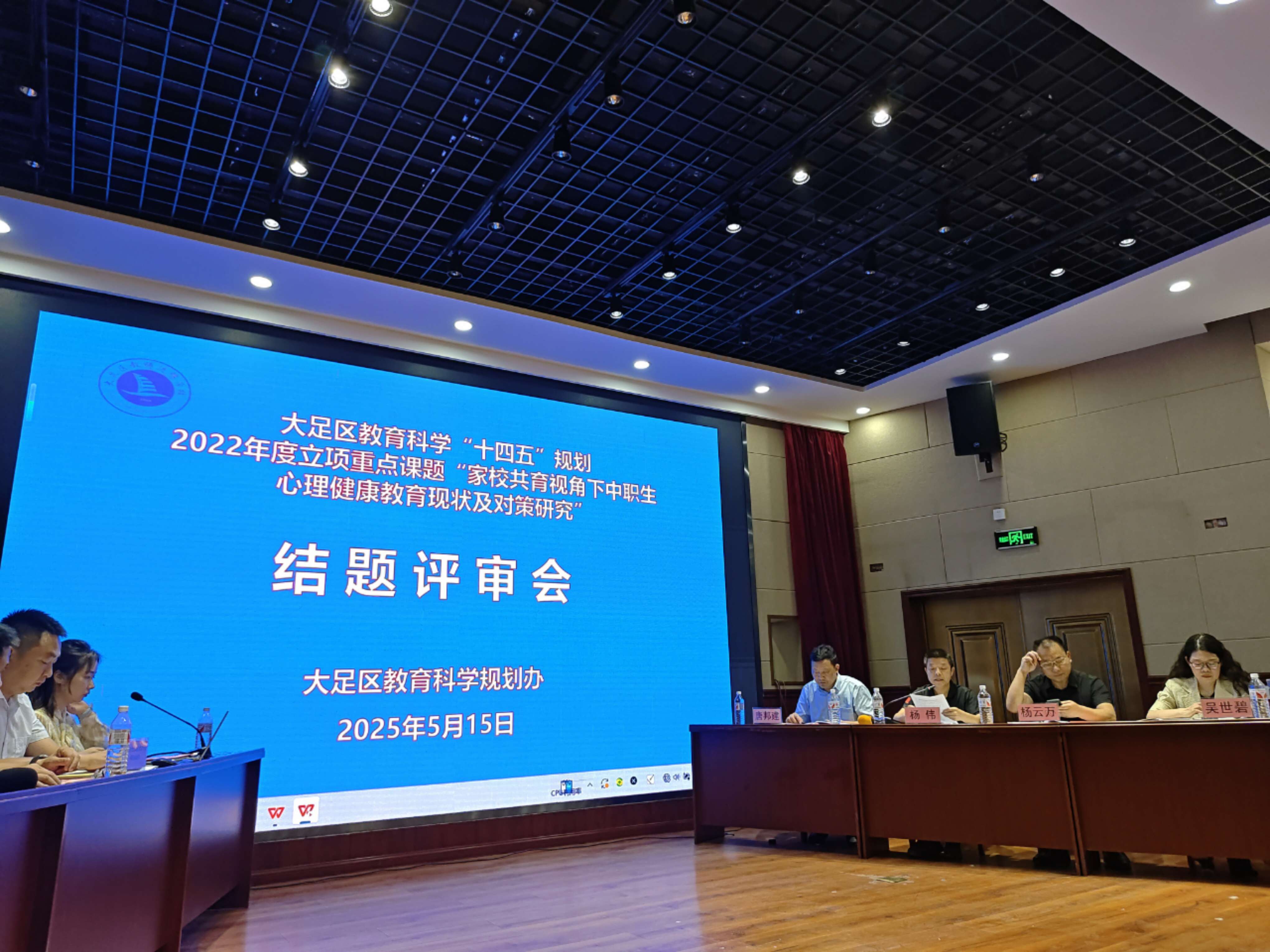 2025年5月15日下午,大足区教育科学“十四五”规划2022年度立项重点课题“家校共育视角下中职生心理健康教育现状及对策研究”结题评审会在大足职教中心第三学术报告厅隆重举行。大足区教师进修学校副校长杨伟、科研室主任杨云万、科研室副主任吴世碧,大足区职教与技术中心主任唐邦建等区级结题评审组专家,职教中心领导、课题组成员齐聚一堂,共襄课题结题盛事。会议由杨云万主任主持。