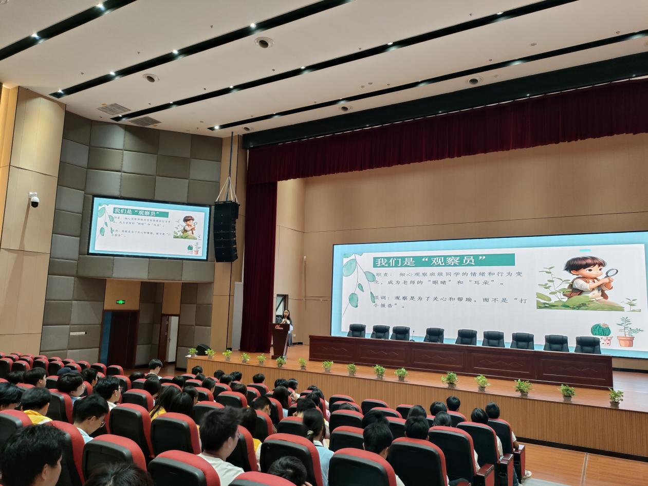 在大会的最后,杨老师鼓励全体心理委员积极发挥“心灵守护者”的作用,用每一次细致的观察和温暖的倾听,在班级中播撒充满阳光与希望的“晴”种子,共同营造一个温暖、包容、相互支持的成长“心”环境。