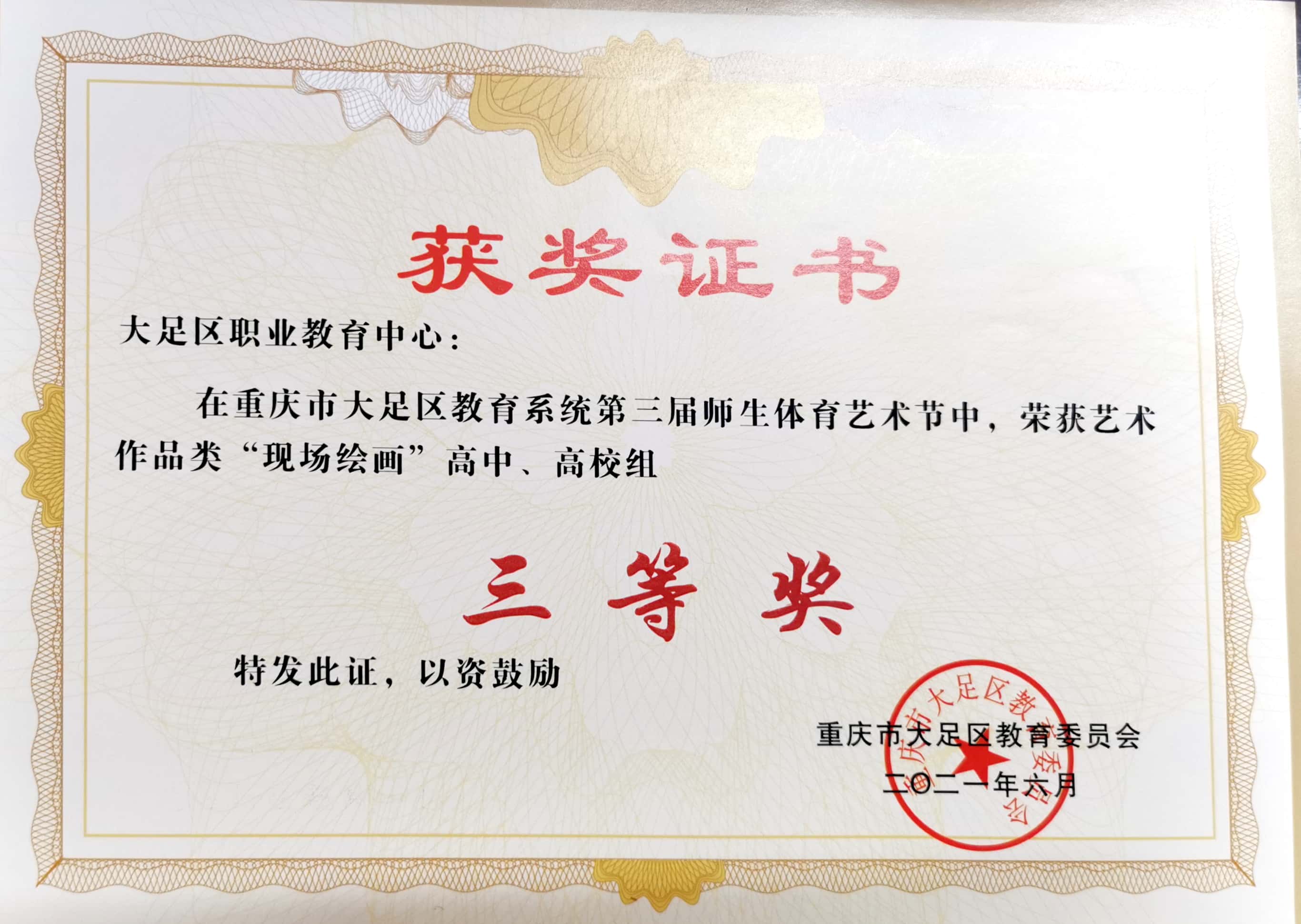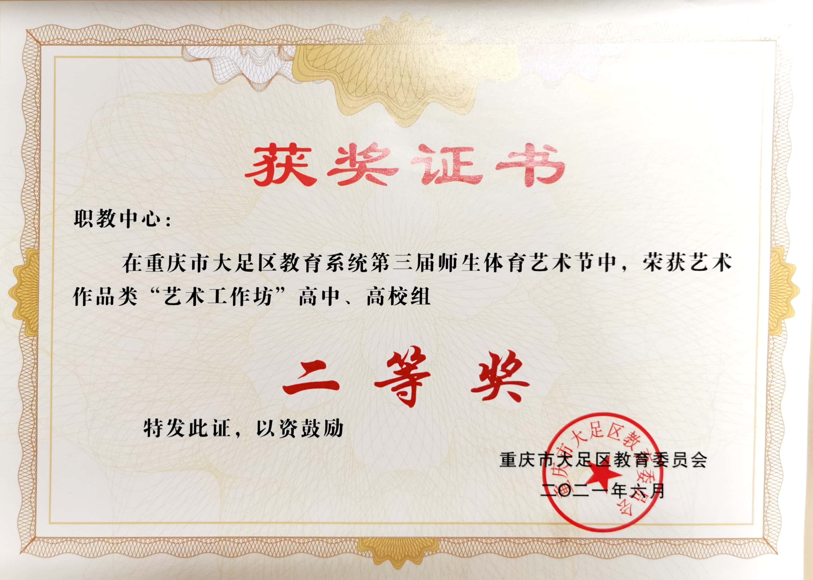 重庆市大足区教育系统第三届师生体育艺术节中,荣获艺术作品类“艺术工作坊”高中、高校组 二等奖