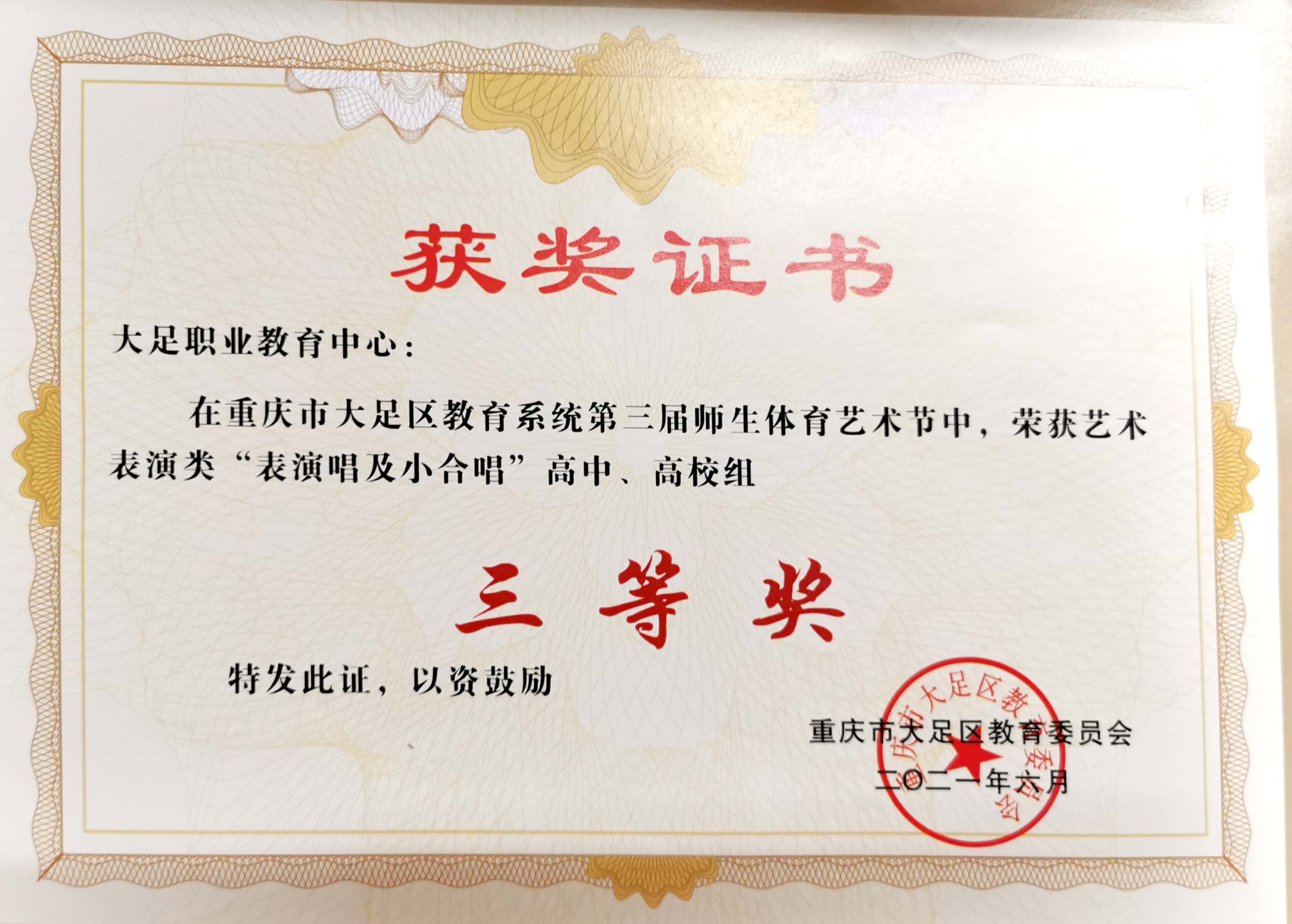 重庆市大足区教育系统第三届师生体育艺术节艺术表演类“表演唱及小合唱”高中、高校组三等奖