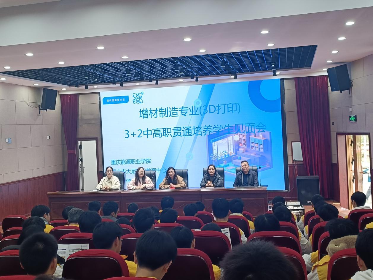 交流会结束后,重庆能源职业学院人工智能与大数据学院的领导、老师到大足职教中心第三学术报厅与增材制造专业(3D打印)3+2中高职贯通培养学生见面交流,向学生们详细介绍了他们学校的概况以及专业特色,为学生们提供了更多了解不同院校专业的机会,也为两校学生之间的交流互动搭建了桥梁。