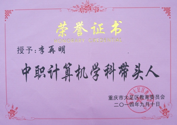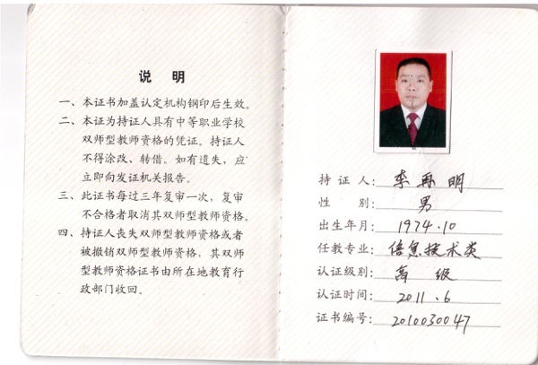李再明:重庆市计算机专业学科带头人、重庆市骨干教师、大足区学科带头人、重庆市教师教育专家资源库成员、重庆市中等职业学校教师高级专业技术资格评审委员会委员;重庆市大足职业教育中心教务处主任、重庆市大足职业教育中心机电工程部部长,高级双师型教师;多次到其他学校进行专业讲座、经验交流;多次到企业进行人力资源培训,效果良好。