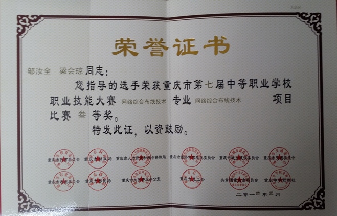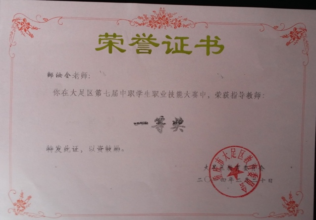 学生参加市、区级技能大赛成绩突出,获重庆市一等奖1项 、三等奖2项 、大足区技能大赛中获得一、二等奖共16项