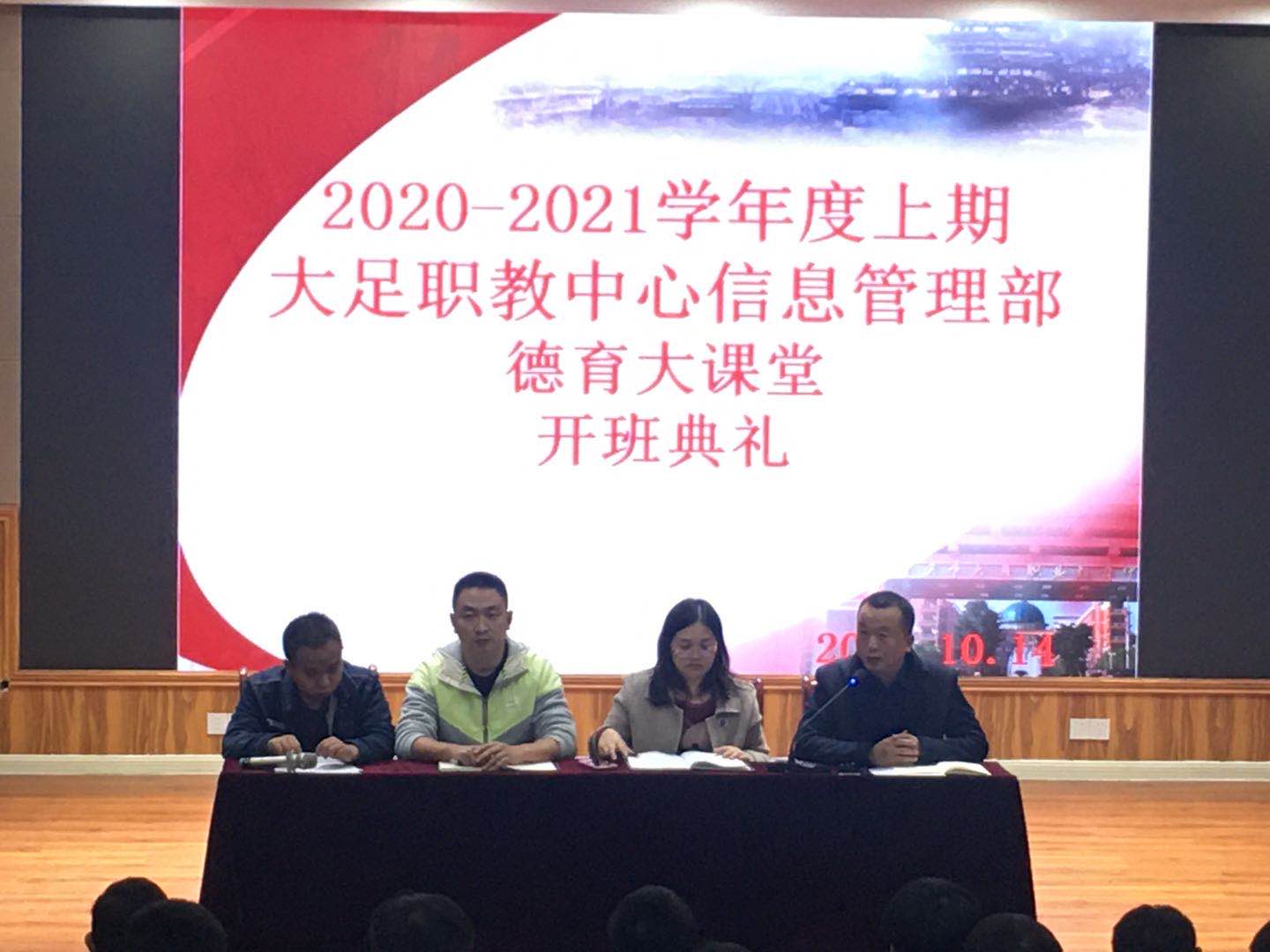 德育大课堂开班典礼于2020年10月14日下午4点在第二阶梯教室举行。典礼由黄俊彪老师主持,专业部德育管理人员、各主讲教师和全体学员参与。会上学生处主任甘雨、信息管理部党支部书记易廷英、信息管理部副部长邹汝全、班主任黄俊彪老师分别发言。发言从不同的角度明确了开展德育大课堂活动的目的意义,提出了各项具体要求,共同表达了对活动开展将取得良好效果的信心和期许。