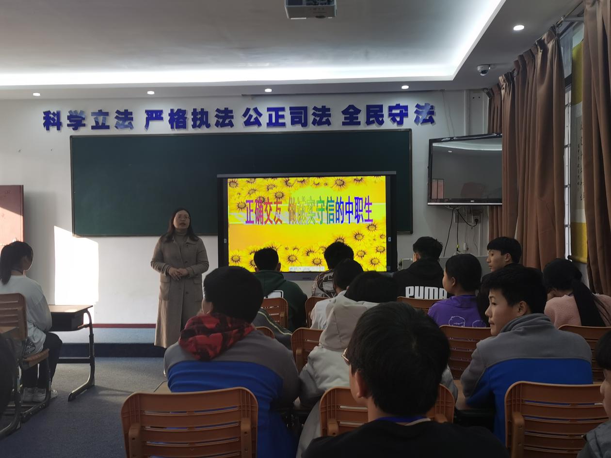 课上,易廷英老师精神饱满,教态从容,以“正确交友,做诚实守信的中职生”为题,分相识、相知、相近、相约四个章节进行授课,从“什么是诚信”“为什么要讲诚信”到“如何做到诚信”逐层展开,紧扣论题辅之名言警句、小故事等发人深省的论据,联系学生生活实际,对学生进行耐心细致的教育。学生听讲认真,笔记积极,遵守课堂纪律。师生互动良好,课堂气氛热烈。