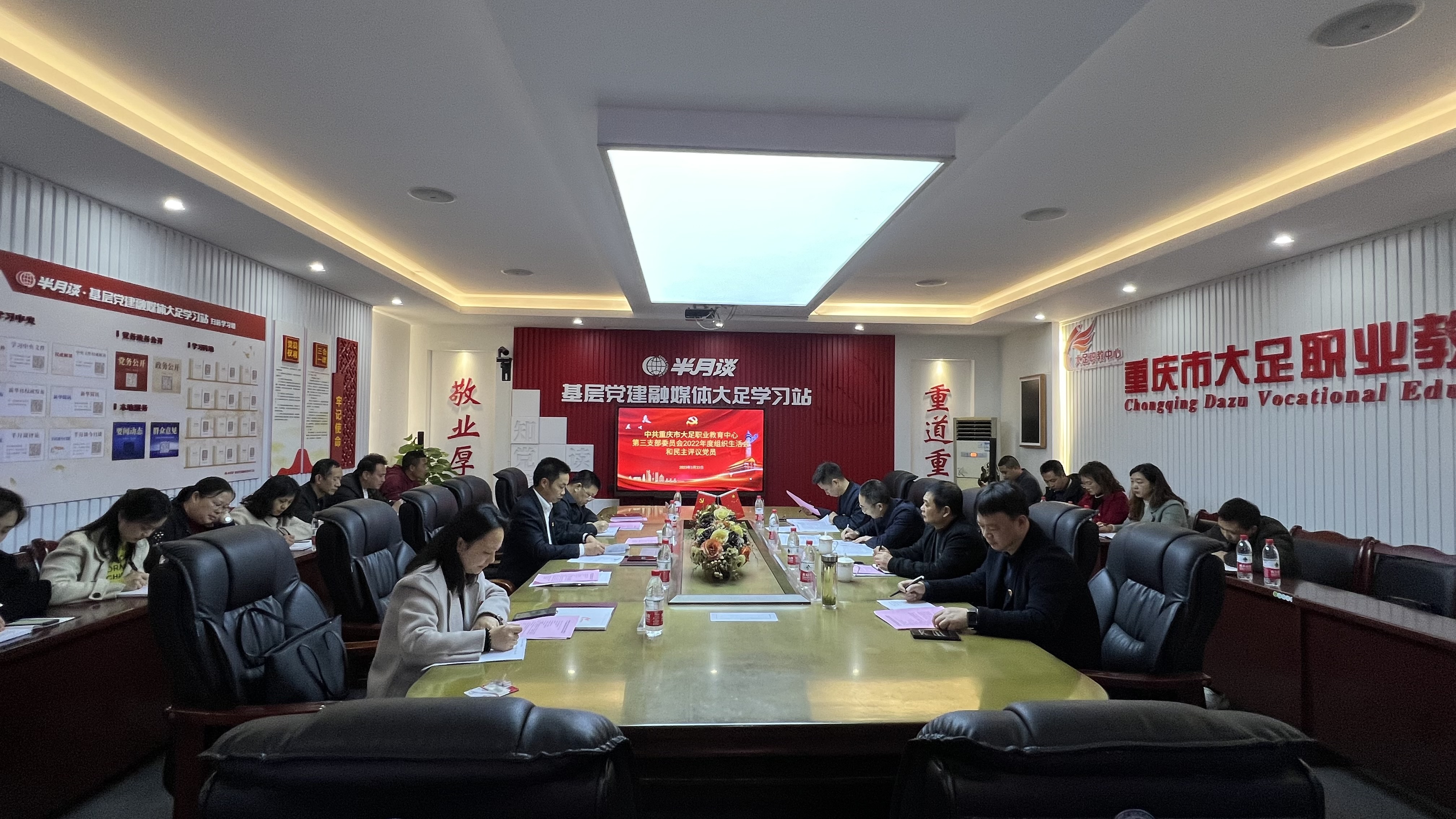 3月23日下午14:30,中共重庆市大足职业教育中心第三支部委员会在励志楼2楼会议室组织开展2022年度组织生活会和民主评议党员。龙岗棠香学区办督导办党建工作领导小组第三组织生活会指导小组莫君为、邢中荣同志列席指导。支部全体党员参会开展活动。
