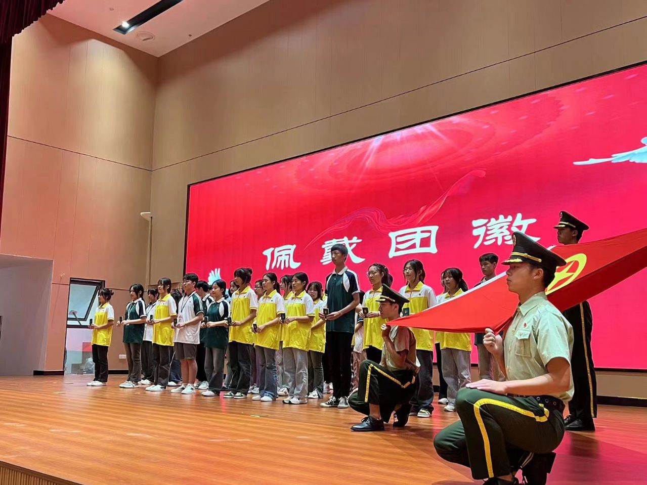 佩戴团徽。团徽,是一个代表共青团的徽章,它不是一个普通的装饰品,也不是一般的纪念章,而是共青团肩负重任的标志,在老团员的示范带领下,每名新团员都在左胸前佩戴上了光荣的团徽。佩戴团徽后,在老团员蒋炅呈同学的领誓下,各位新团员面向团旗、右手握拳高举过肩,庄严宣誓。