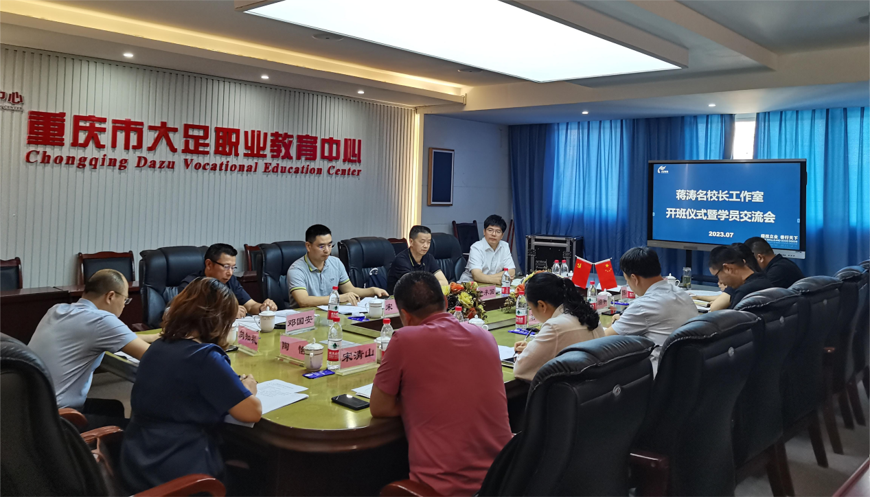 为深入贯彻《重庆市教育委员会关于开展 2022 年中小学骨干校长评选工作的通知》(渝教人函〔2022〕44 号)和《重庆市教育委员会关于公布 2022 年重庆市中小学骨干校长名单的通知》(渝教人发〔2023〕3 号)等文件要求,7月5日下午,蒋涛名校长工作室开班仪式暨学员交流会在重庆市大足职业教育中心励志楼会议室举行,会议由名校长工作室学员宋海同志主持。