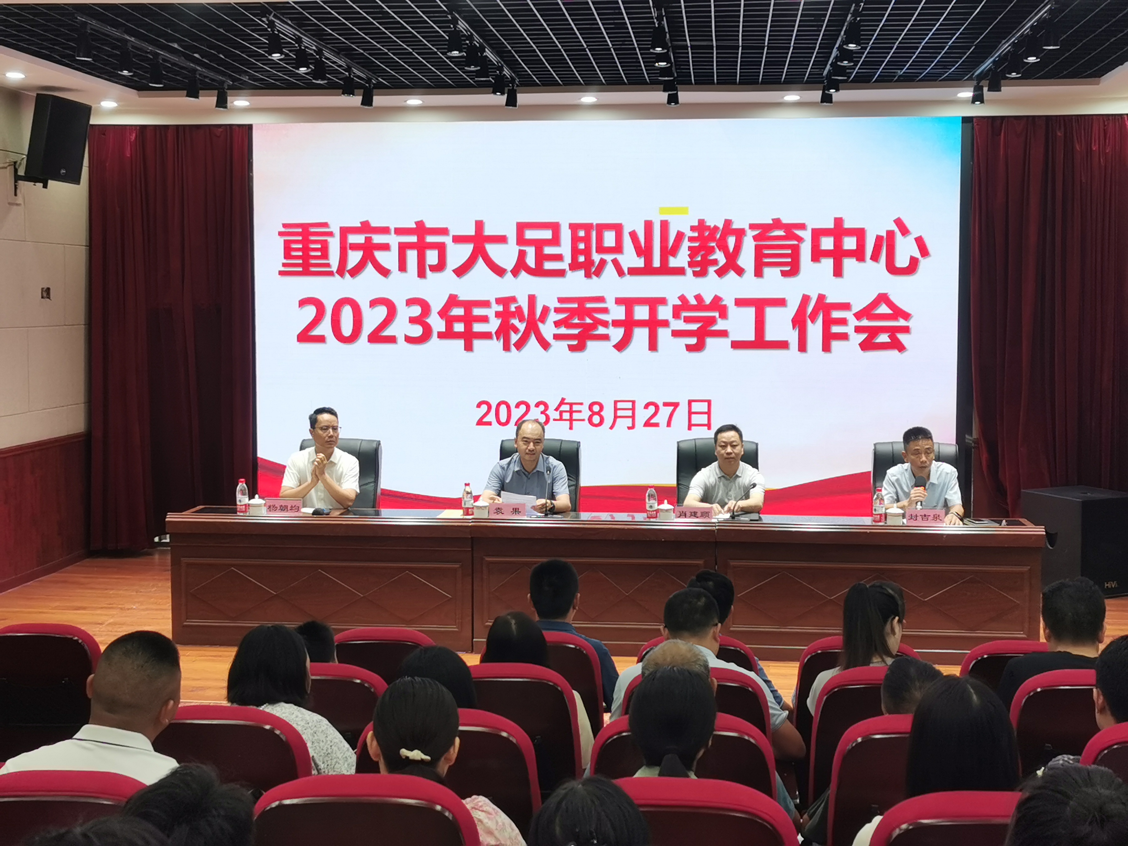 8月27日上午9:00,重庆市大足职业教育中心新任党委书记、校长见面会在第三学术报告厅举行。区委组织部副部长袁果、区委教育工委副书记肖建顺出席会议,职教中心新任党委书记杨朝均、全体校级领导班子成员、中层干部、教师代表参会。会议由职教中心党委副书记、校长封吉泉主持。