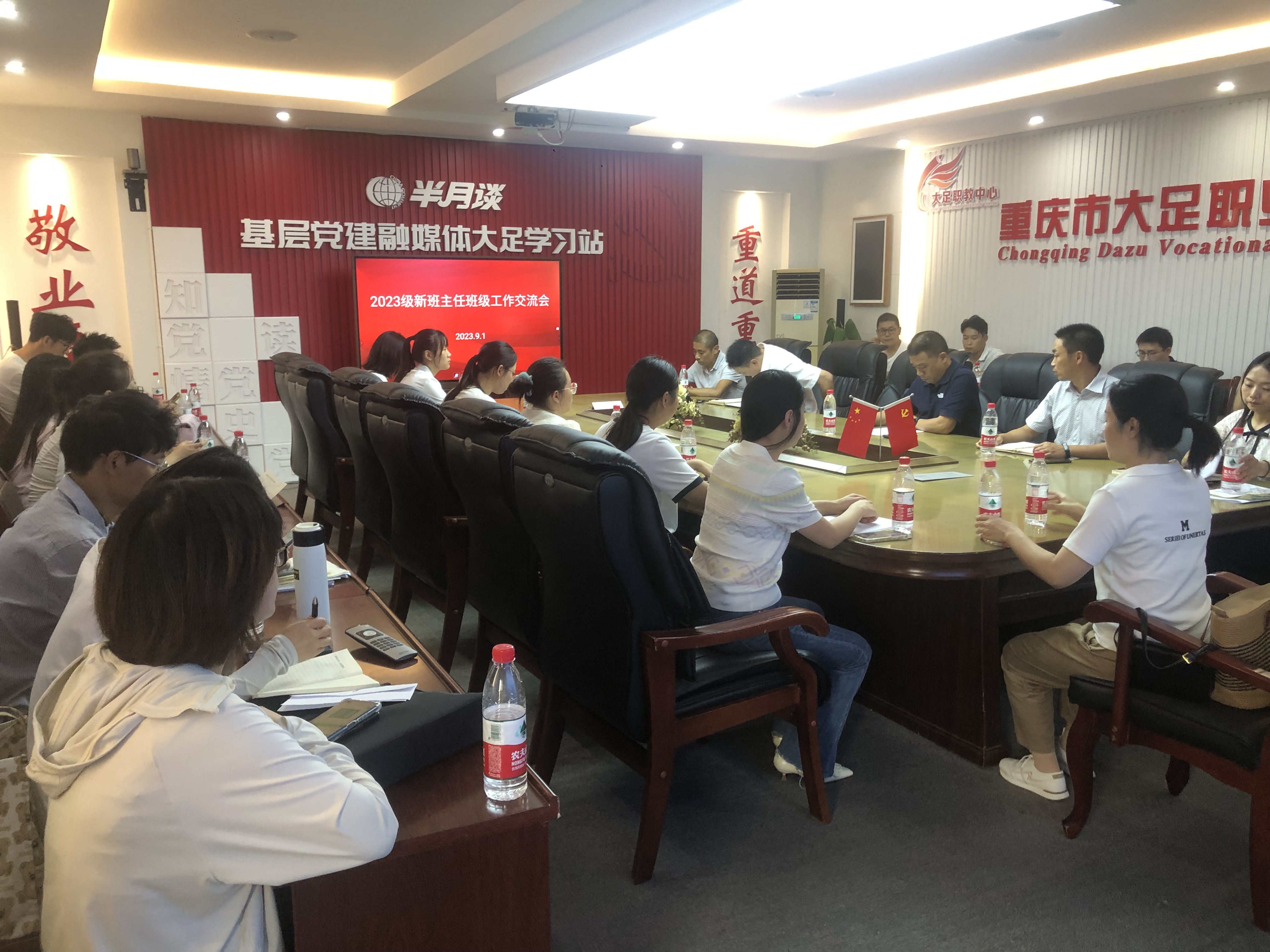 2023年9月1日下午,重庆市大足职业教育中心在海棠新城校区励志楼二楼会议室召开高2023级新班班主任班级工作交流会。本次会议由年级组长粟廷富主持,校长封吉泉、副校长李再明、安稳办主任朱文彬、教务处副主任钟仕娟、及年级组全体管理人员出席,2023级全体新班主任参会。