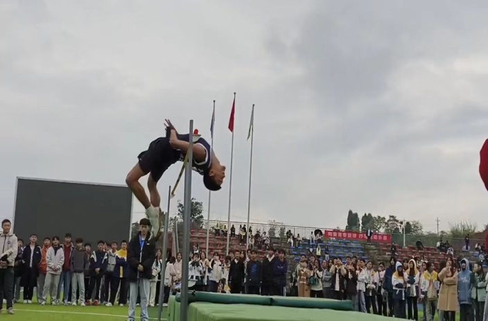 图为2021级32班吴新渝以1.73的成绩打破校运会跳高记录荣获第一名。