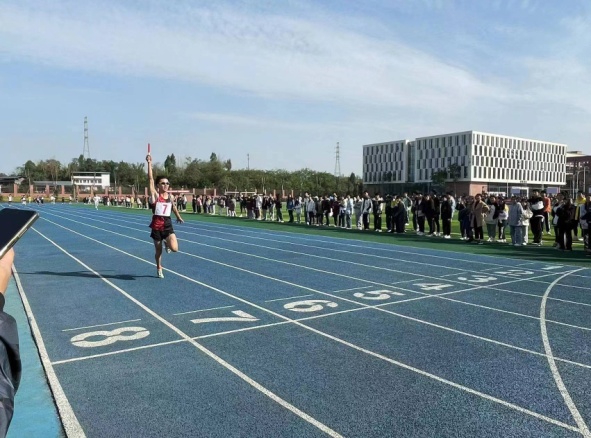 图为2022级22班胡仁意以23”25的成绩打破校运会200米记录荣获第一名。