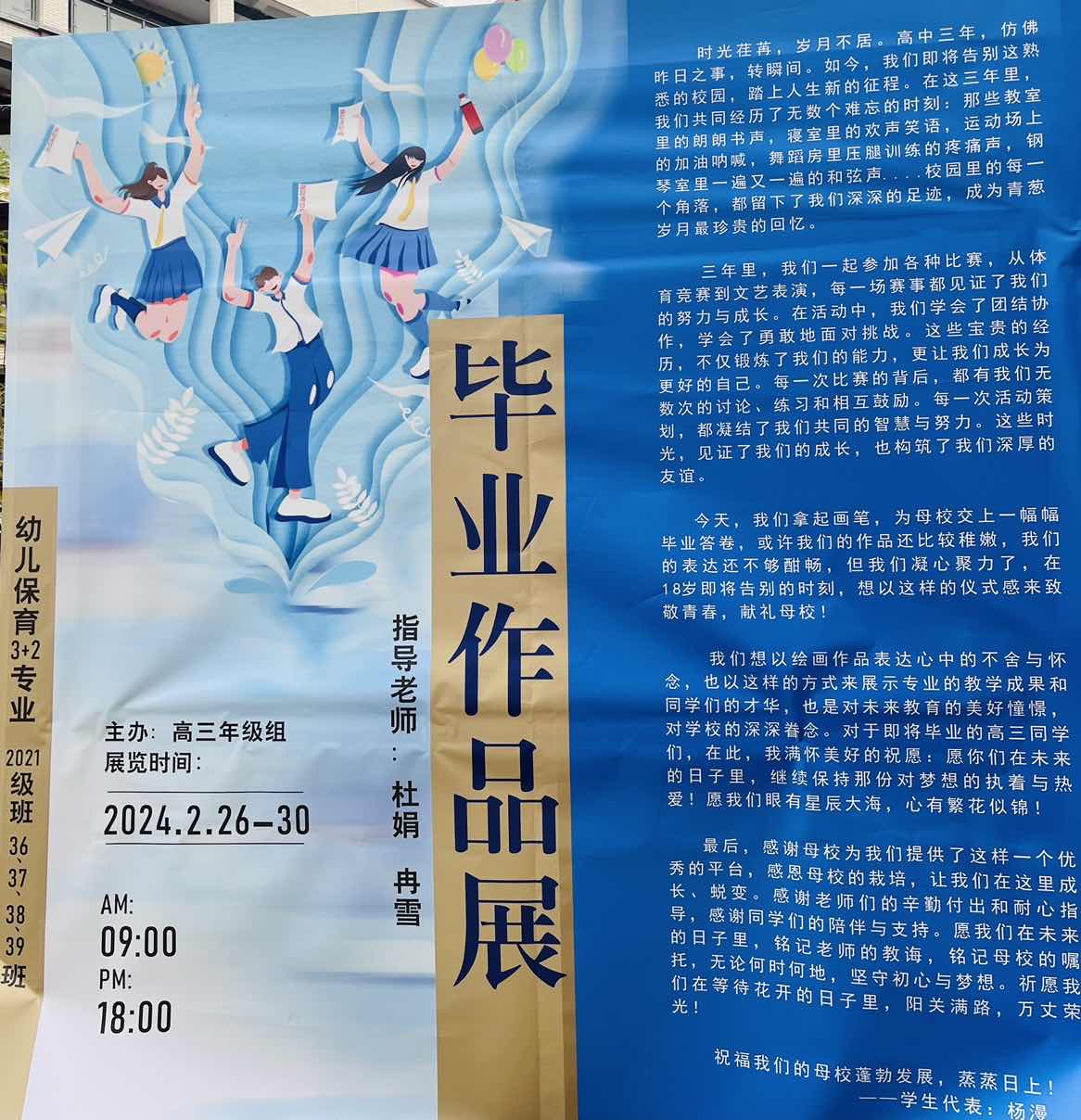 为了展示幼儿保育专业学生的艺术才华,激励发展我校艺术教育,努力营造积极向上、健康文明、多样发展的校园艺术文化氛围,展示我校幼儿保育专业学生的锐意进取、蓬勃发展、多才多艺的精神风貌,促进我校艺术教育高质量发展。2024年2月26日,2021级幼儿保育3+2我校校区举行创意无限 韶华自在为主题的毕业作品展