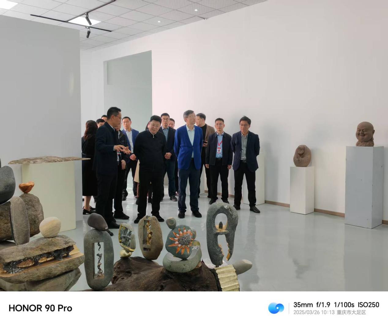 谢局长先后参观了接待厅、大师创作室、培训室和展厅。走进展厅时,一件件具有大足美学特征的石雕艺术品深深吸引了他,他对作品大赞赏,并详细了解了作品价格,市场行情等。
