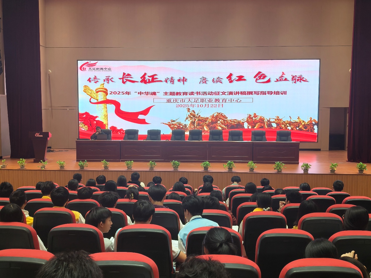 为深入学习贯彻习近平新时代中国特色社会主义思想,落实习近平总书记对关心下一代工作的重要指示批示精神,2025年10月22日,大足职教中心在高新校区仁智楼报告厅开展了中华魂“传承长征精神,赓续红色血脉”主题教育读书活动征文演讲稿撰写指导培训。主讲教师校团委干事王行艺,高新校园各班推荐喜欢演讲、爱好写作的同学参加培训