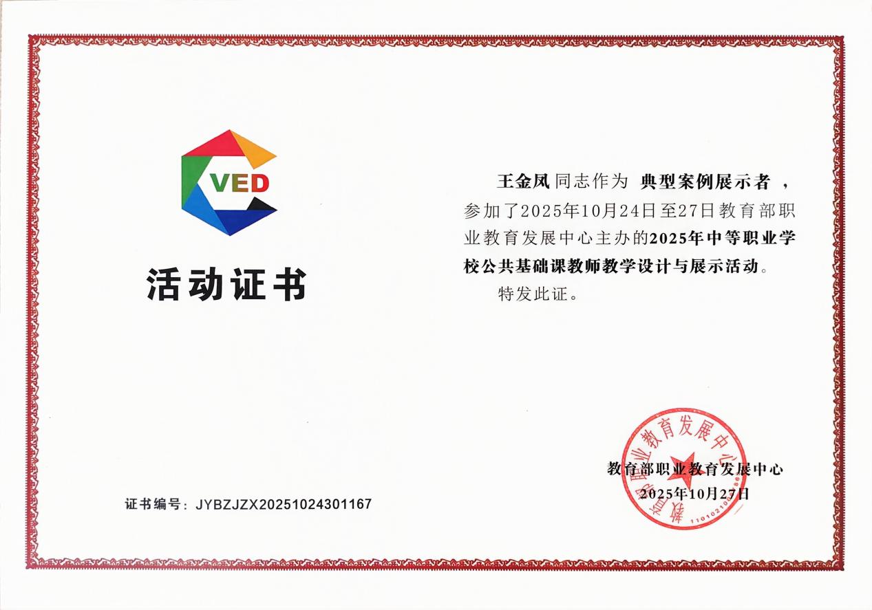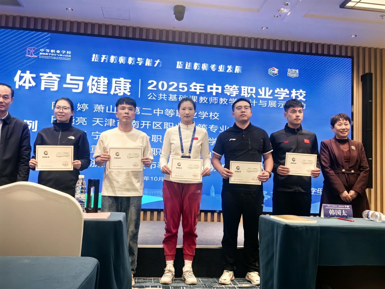 2025年10月26日,从教育部职业教育发展中心主办的2025年中等职业学校公共基础课教师教学设计与展示活动现场传来捷报。经过激烈角逐,重庆市大足职业教育中心王金凤老师以其作品《精技砺能,铸魂强体——篮球“运跑急停急起”技术的教学创新与实践》,在全国128名体育教师中脱颖而出,荣获典型案例(一等奖),并作为重庆市唯一代表在全国进行展示,一举实现了重庆市中职体育学科在此类国家级赛事中“零的突破”。