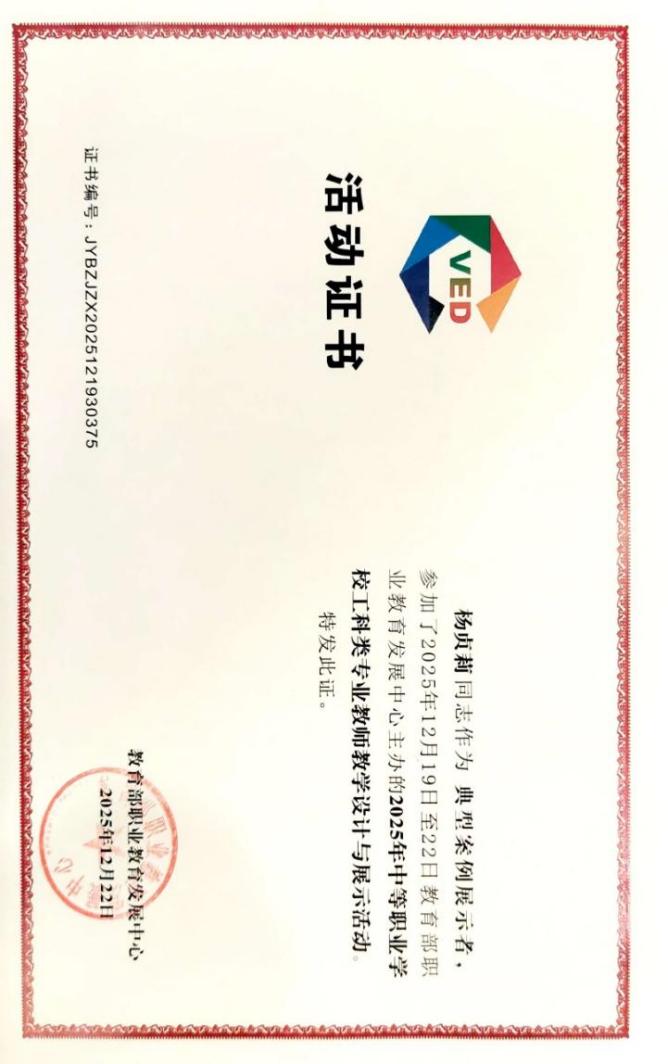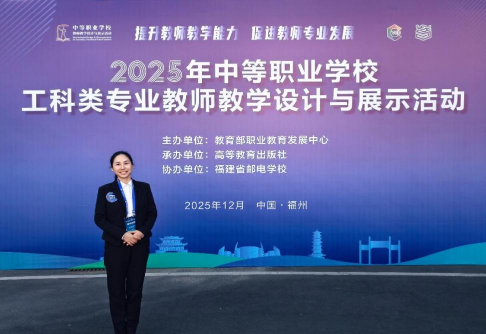 2025年12月19日至22日,在教育部职业教育发展中心主办、高等教育出版社承办、福建省邮电学校协办的“2025年中等职业学校工科类(计算机)专业教师教学设计与展示活动”中,重庆市大足职业教育中心教师杨贞莉凭借匠心独具的教学设计、扎实的专业功底与精彩的现场呈现,在全国136名参赛选手中脱颖而出,荣获全国典型案例(一等奖)。