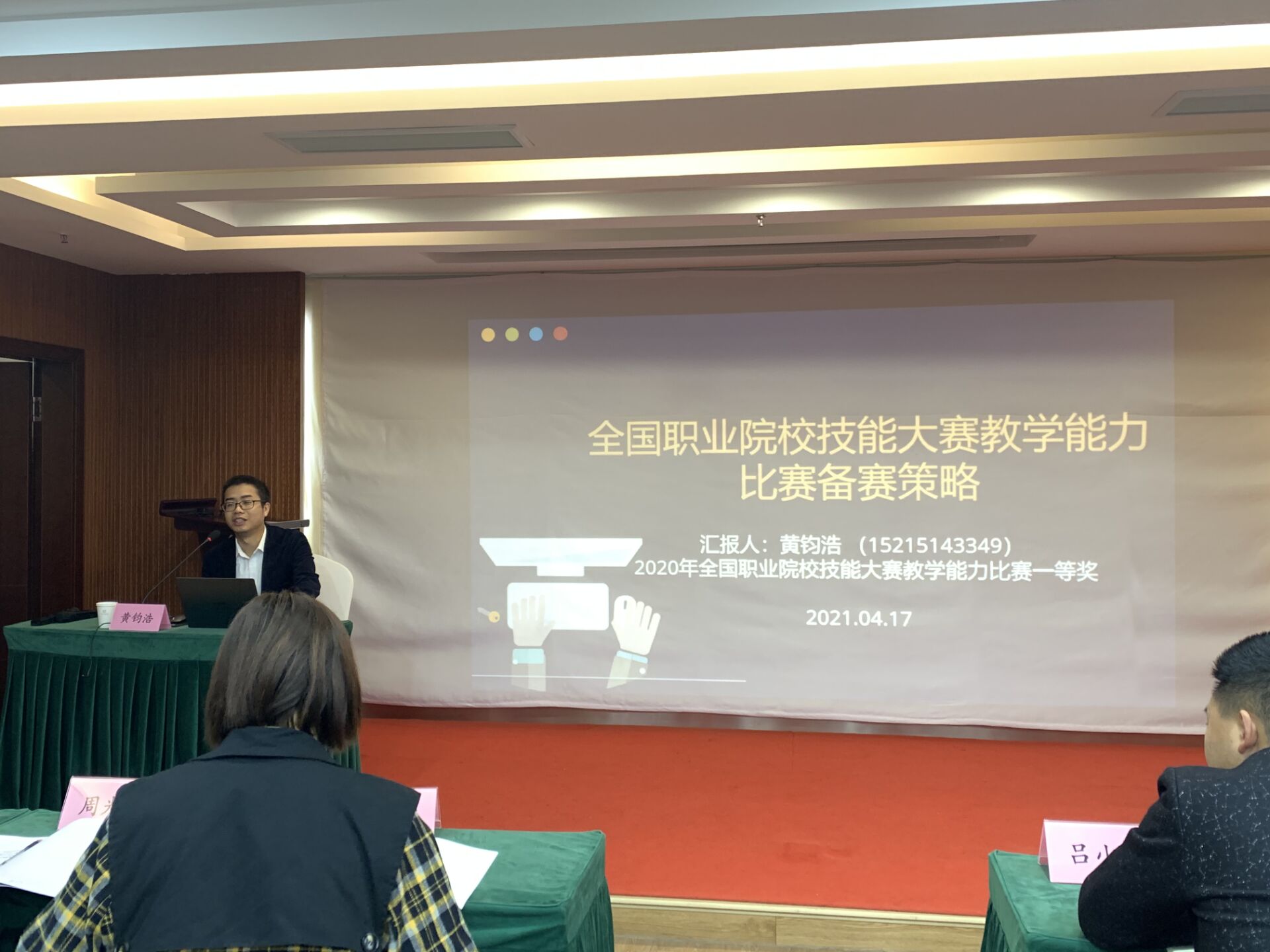 当日全天,为参训教师进行培训的是来自九龙坡职教中心2019年获得全国职业院校教学技能竞赛一等奖的小组代表黄钧浩老师,黄老师同时也是九龙坡职教中心汽车专业部部长,他为老师们带来的讲座是《全国职业院校技能大赛教学能力比赛备赛策略》。
