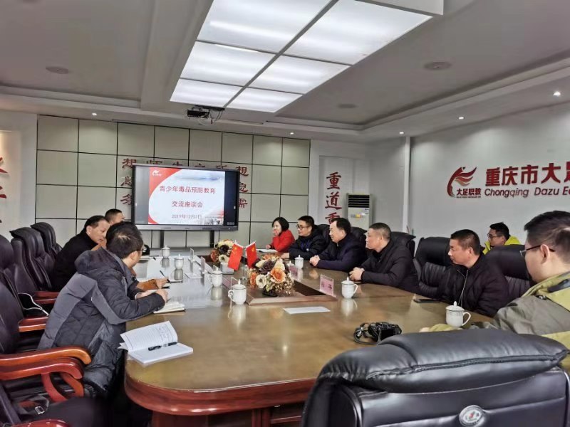参观完毕,来宾一行来到励志楼二楼会议室就“关于青少年毒品预防教育”进行交流座谈。观看学校宣传片后,高武军对大足区禁毒教育工作了肯定评价,对学校“两室”亮点再次点赞。接着与罗其正就大足区禁毒工作以及“两室”的建立进行了深入详细的沟通交流。罗其正强调了普法、禁毒教育这一良心工程的重大意义和学校校长必须提高认识的看法。张海平等同志分别畅谈观后感。大家交流沟通并讨论,气氛融洽。来宾们一致认为,此行很有收获,将会把值得借鉴和可操作的地方,结合梁平实际情况加以推进完善,共同打造一流特色禁毒教育。
