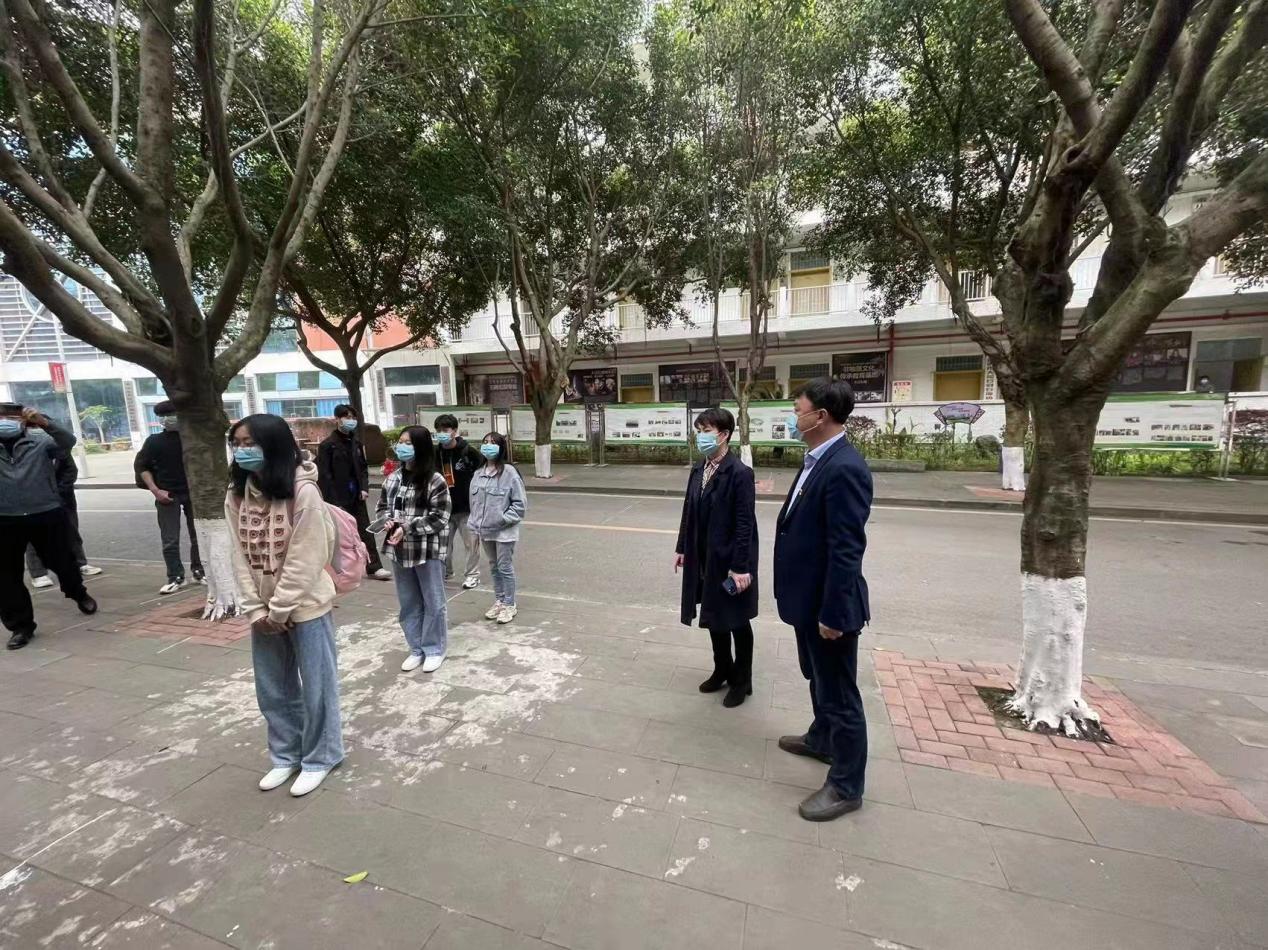 3月25日,职教中心因参加技能高考在高新区就地隔离14天的174名师生,隔离期满平安返校;区教委副主任易兰在学校党委书记、校长蒋涛的陪同下到现场慰问了师生;在学校二学术报厅划定隔离区域,返校师生就地统一隔离等待,待核酸检测报告为阴性,才可返家。