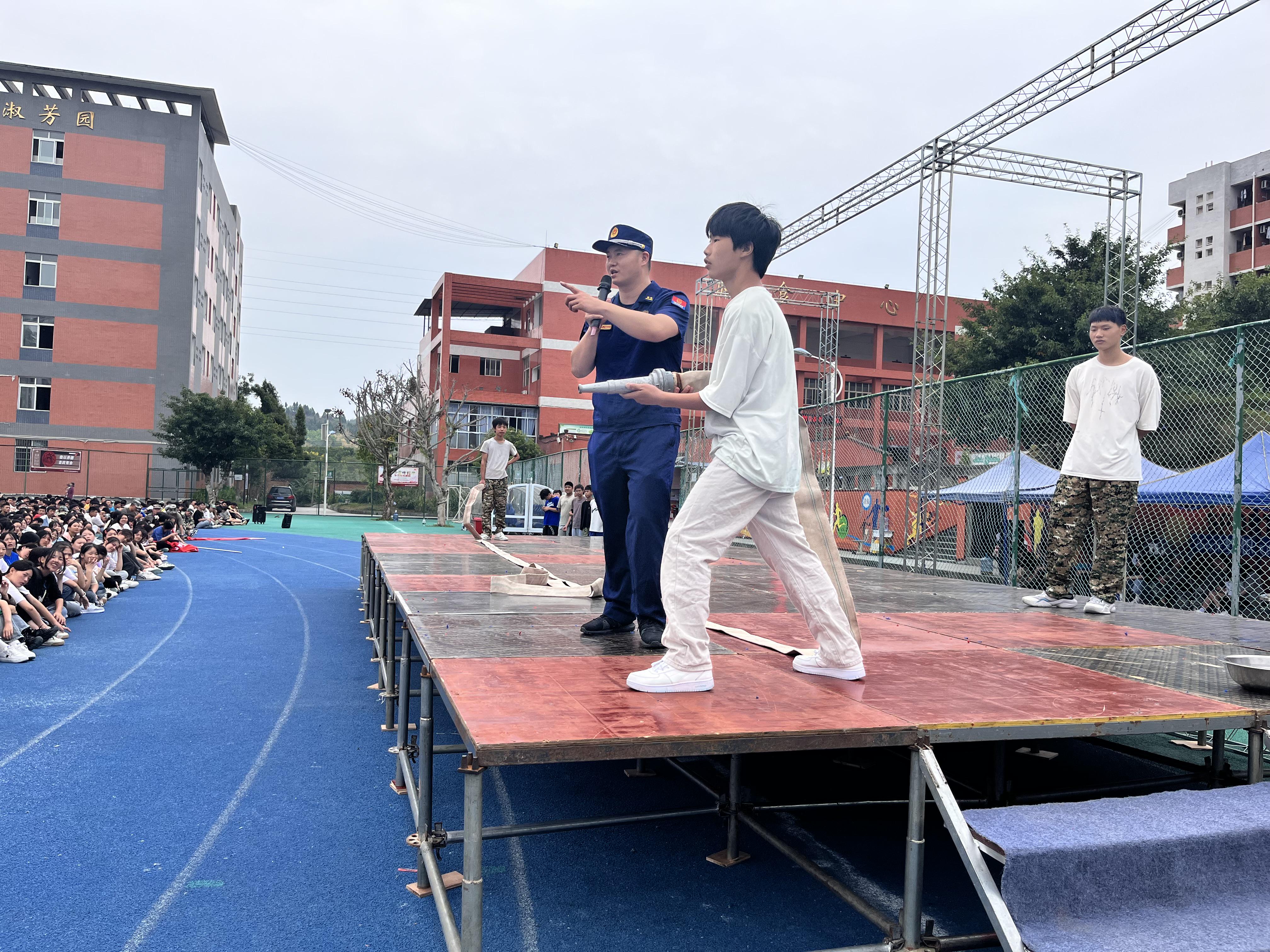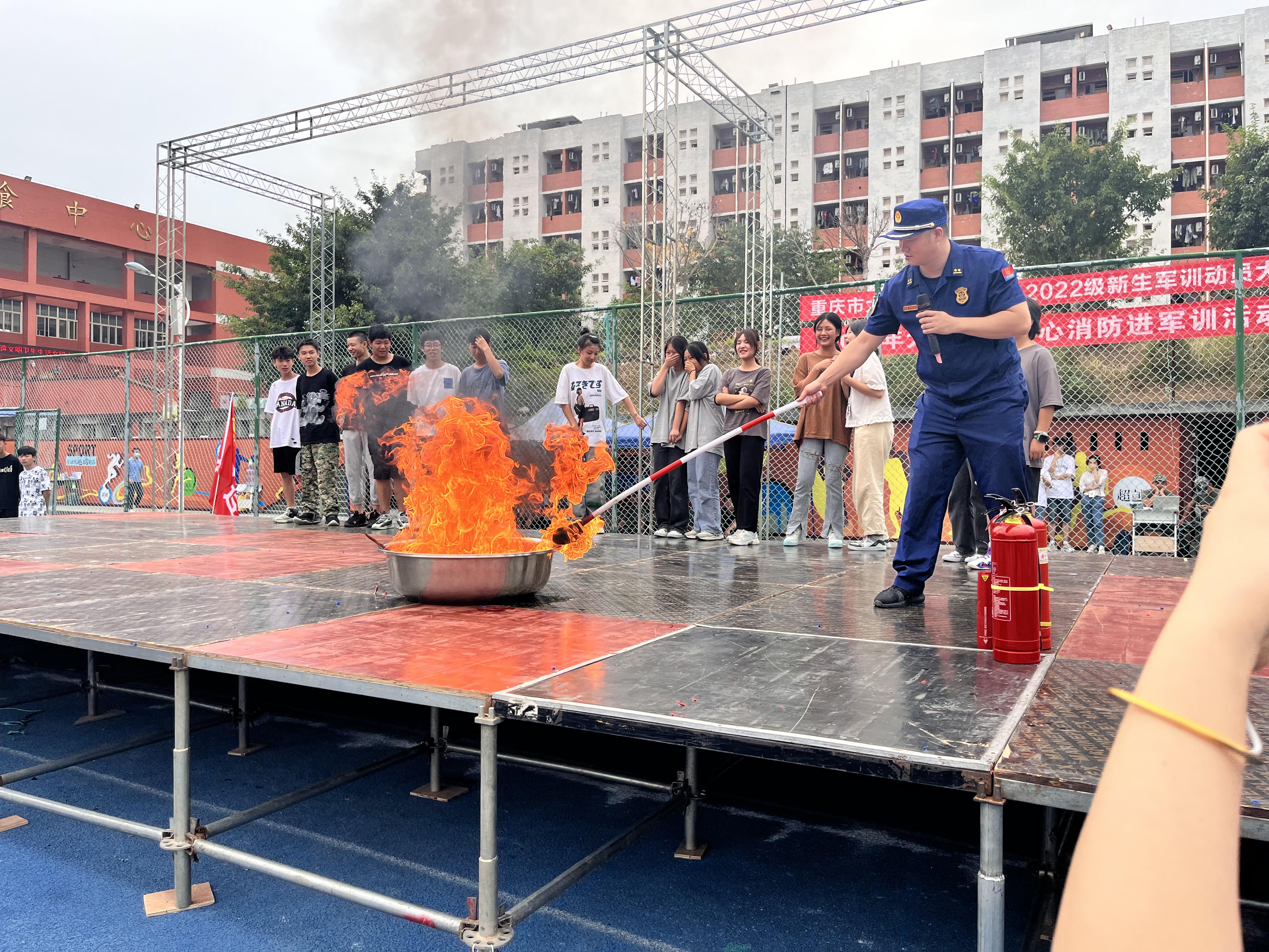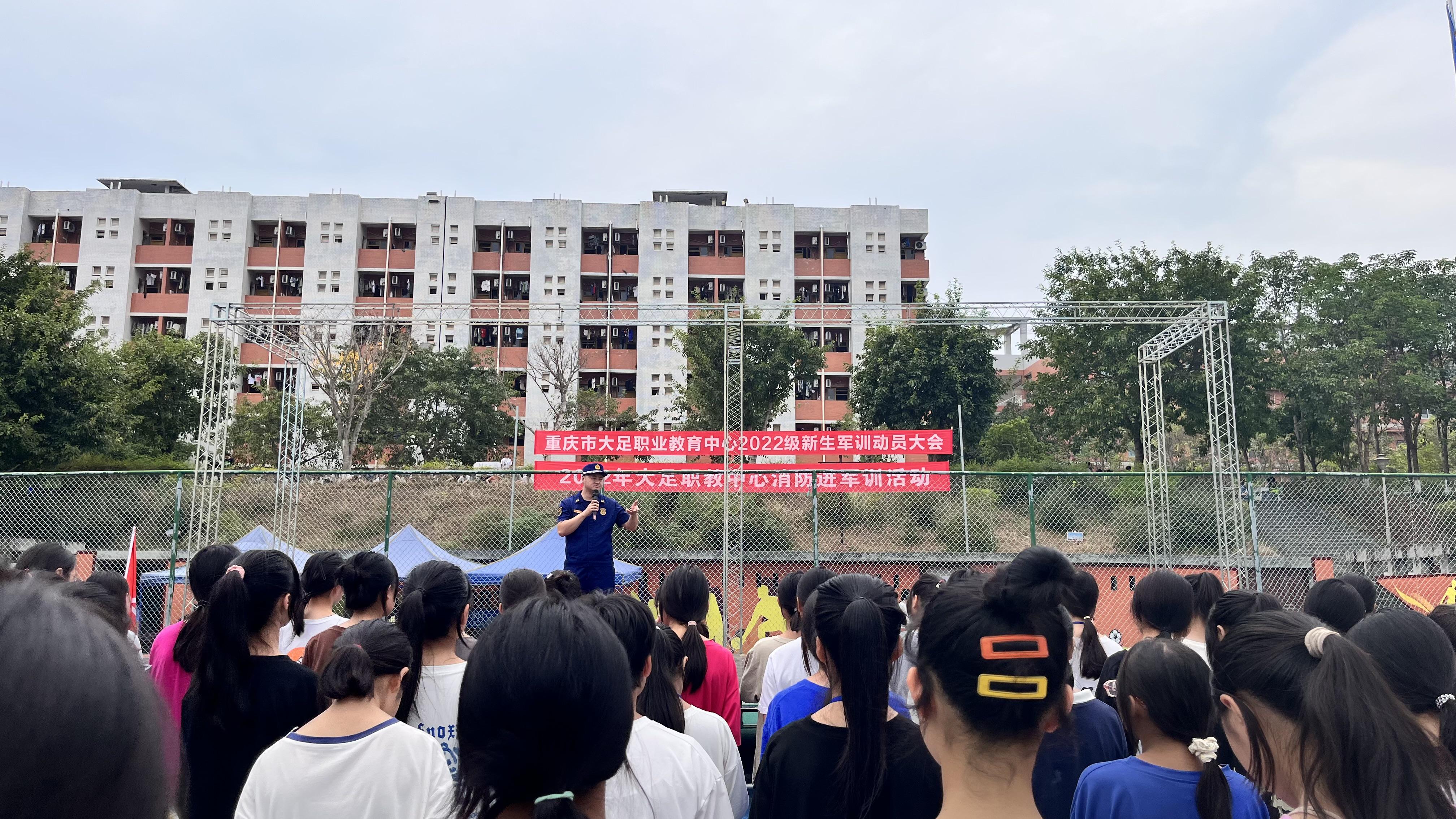 生命安全大于天。为提高全校师生避险逃生能力,职教中心利用新生军训间歇,于2022年9月8上午学校运动场开展了消防安全“进军训”暨疏散灭火演练活动。此次活动邀请到了大足区消防救援支队参谋周春城全程参与指导,2022级全体新生观摩了演练活动。