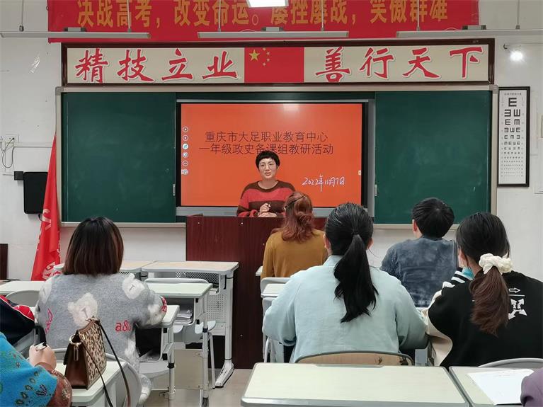 初冬时节,乍寒还暖。为凝聚集体智慧,团结协作备好课,真正做到“教中研、研中学、学中思、思中改”,服务学生健康成长,促进教师专业发展,进一步提高政史学科课堂教学质量,2022年11月7日,大足职业教育中心一年级政史备课组在4201教室组织开展本期第一次集体备课教研活动。会上校教务处副主任李海燕到会指导,一年级全体政史教师参与了此次教研活动。会议由备课组组长孙彩云老师主持。