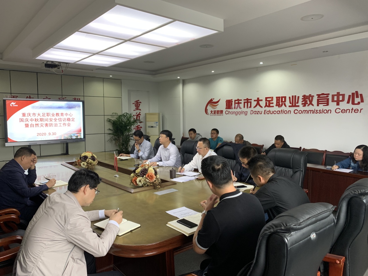 为认真贯彻9月29日全区教育系统国庆中秋期间安全信访稳定暨自然灾害防治工作会会议精神,全面落实上级安全稳定、秋冬疫情防控相关文件要求,确保国庆中秋安全稳定,重庆市大足职业教育中心于2020年9月30日上午8:00在励志楼二楼会议室组织召开安国庆中秋期间安全信访稳定与自然灾害防治专题行政会,传达上级会议精神、布置安排相关工作。会议由学校党委书记、校长蒋涛同志主持,全体行政人员参加了会议。