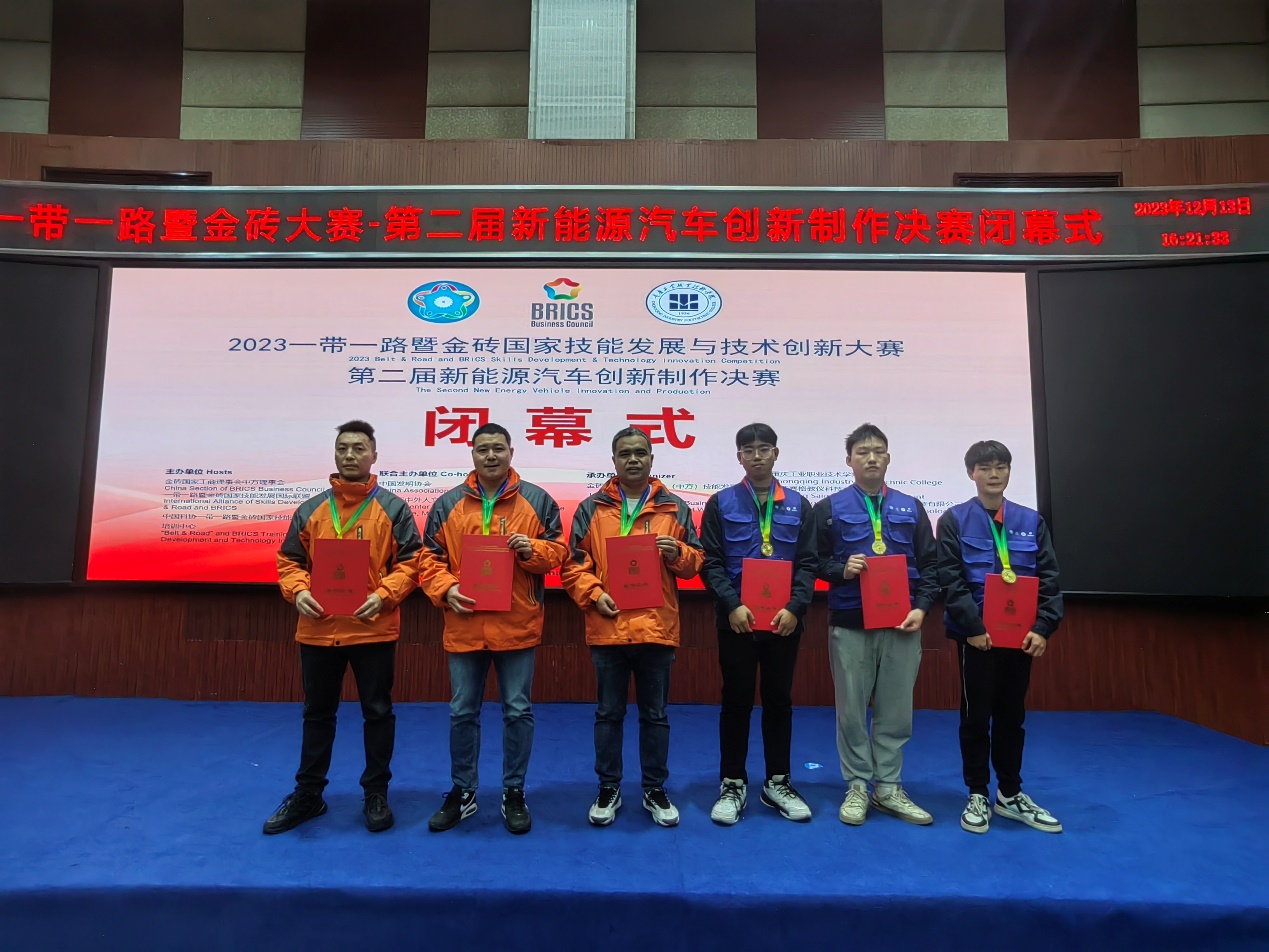 2023年12月11日-13日,2023年一带一路暨金砖国家技能发展与技术创新大赛之第二届新能源汽车创新制作大赛全国决赛在重庆工业职业技术学院隆重举行,重庆市市内外二十余支队伍展开同台竞技。重庆市大足职业教育中心教师组刘琦琪、蔡龙、刘武和学生组宋薄文、吴玥旻、徐杰分别组队参加比赛,成绩优异,斩获一金一铜。