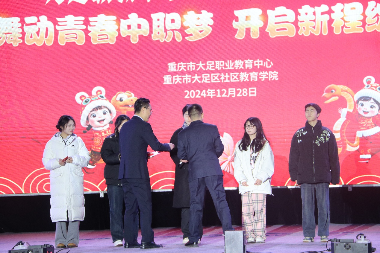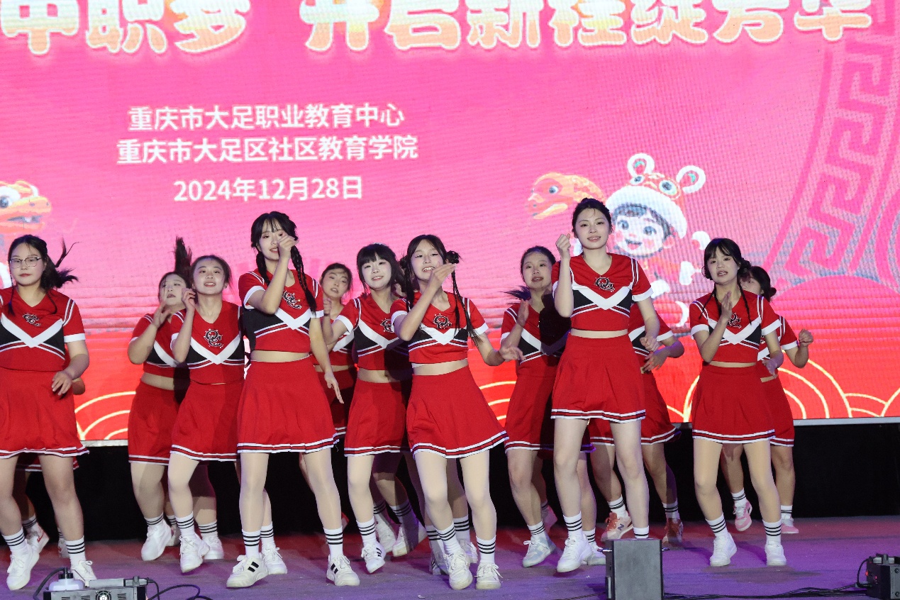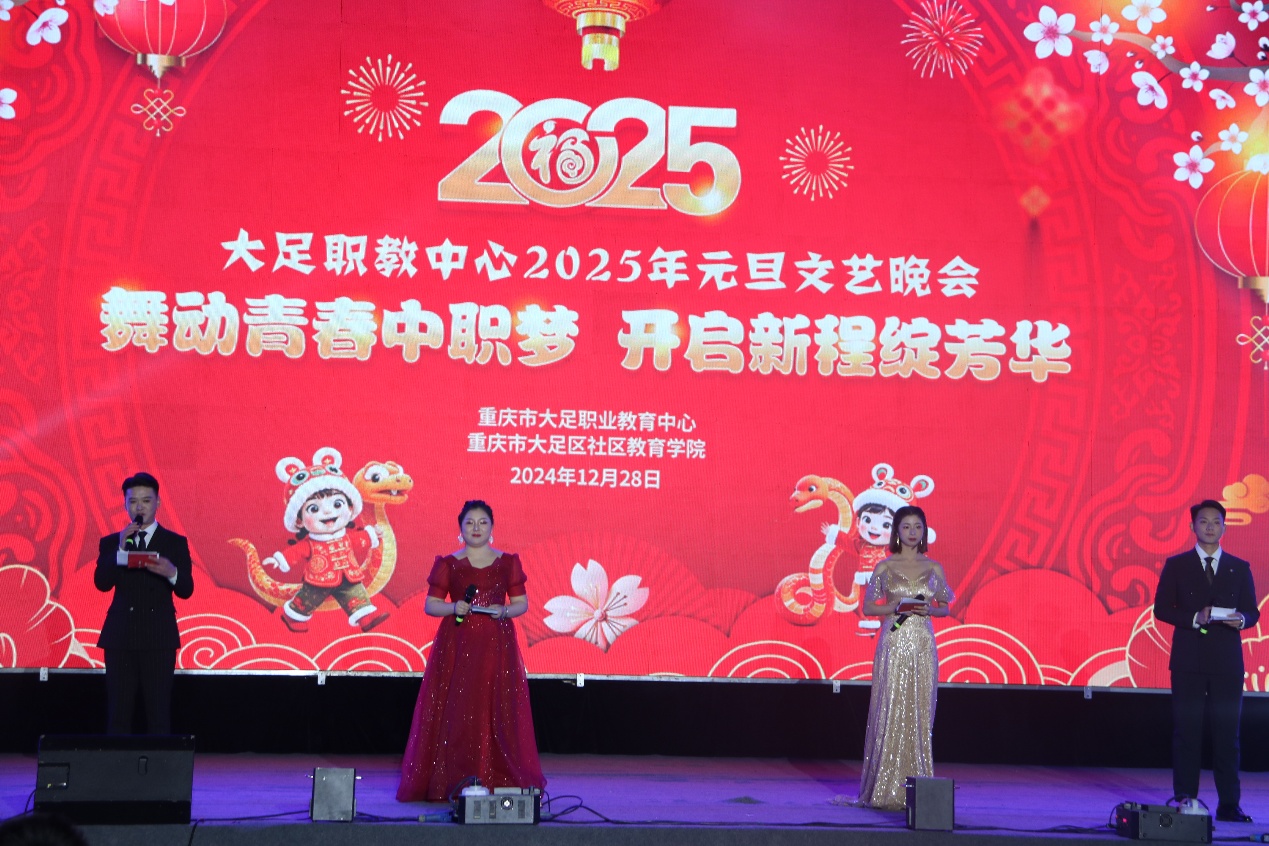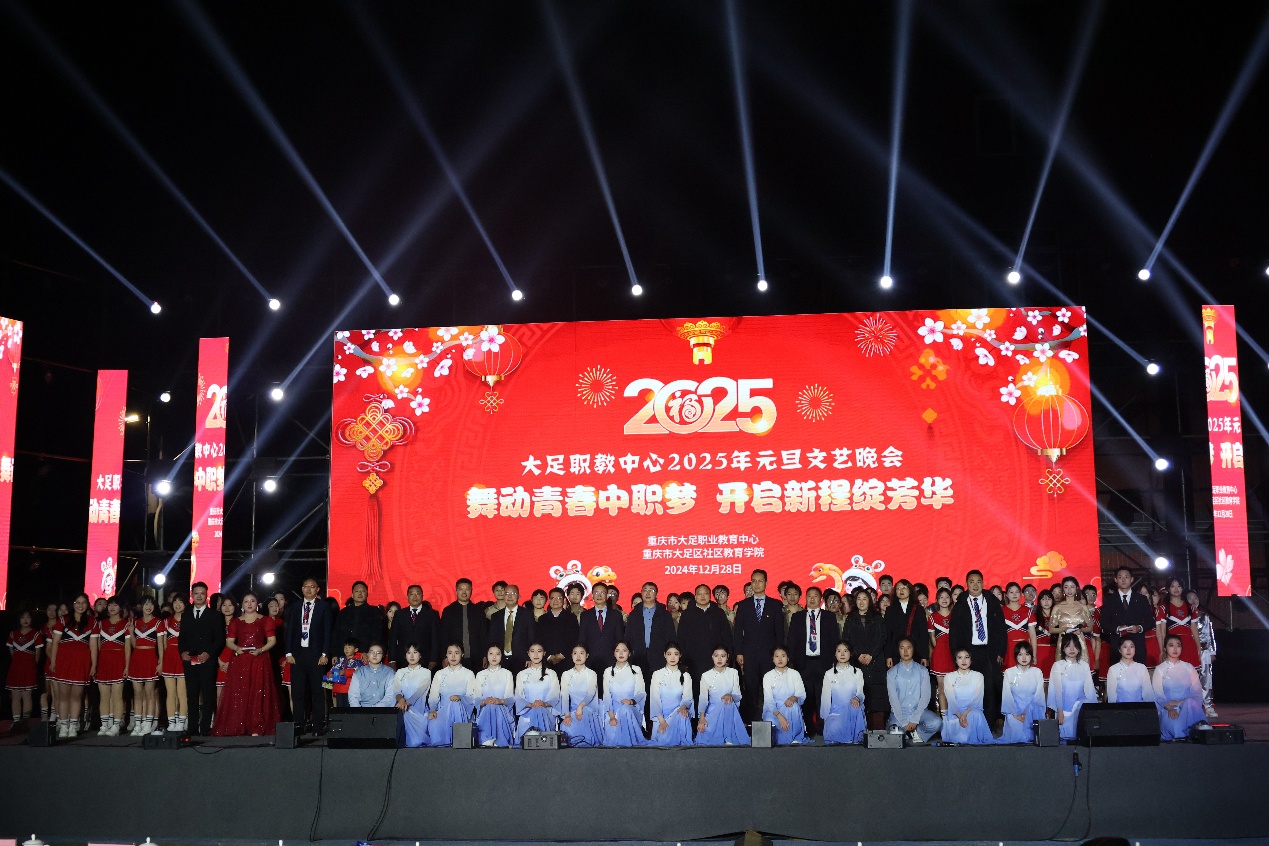 祥龙贺岁辞旧去,瑞蛇纳福迎新来随着2025年元旦佳节的临近,为庆祝新年的到来,2024年12月28日晚6:30,重庆市大足职业教育中心盛大的元旦文晚会准时在海棠校区田径场隆重举行。棠香学区办主任张华德,万古学区办主任陈刚,全区各初中学校代表受邀出席。海棠校区全体师生现场观看演出,高新校区全体师生观看直播。晚会由张亚洲、刘言、阮连杰、万茂琳四位老师联袂主持。