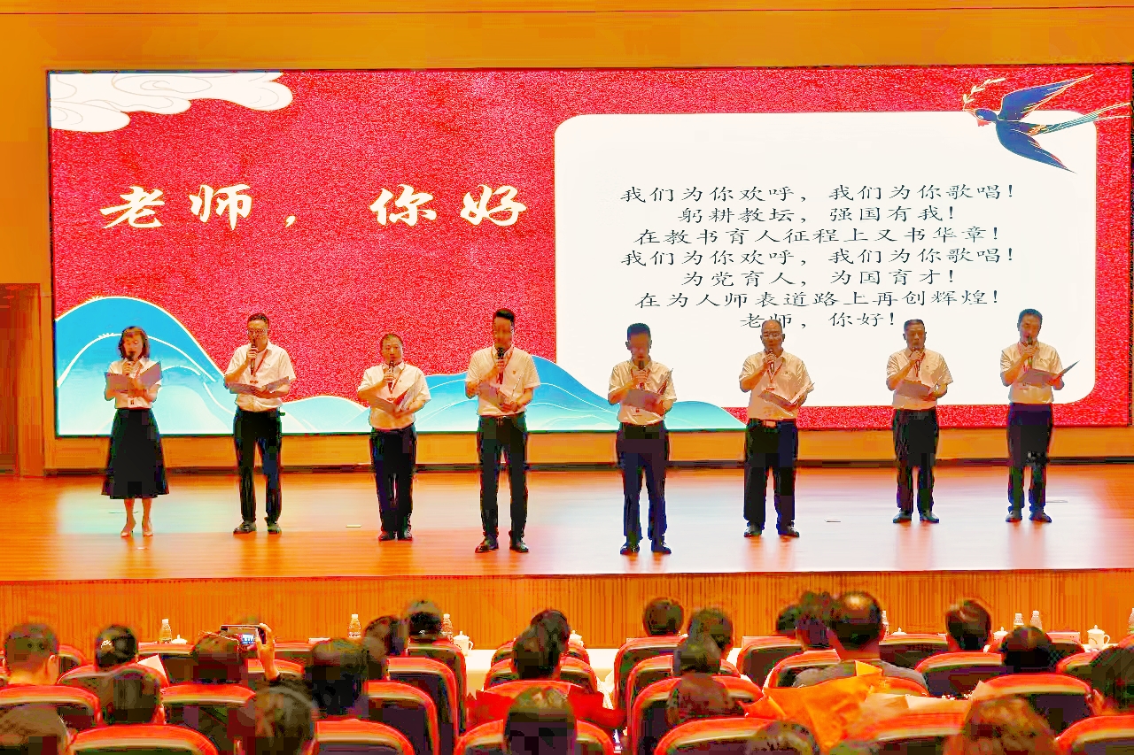 大会上,随着大屏幕上《芳菲九月礼颂师恩》庆祝教师节专题片中职教师生的句句祝福送达到现场,杨朝均书记带领新一届学校领导班子为全体教师带来原创诗歌朗诵节目《老师,你好》,感动了全场。