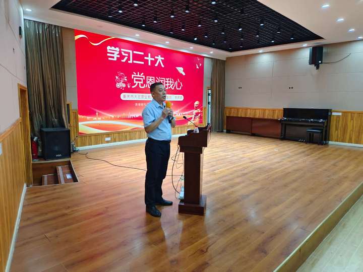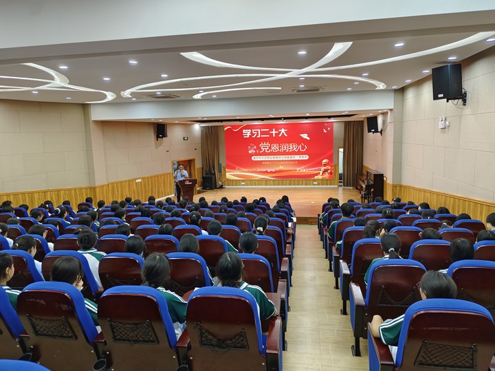 2023年9月11日下午,职教中心党委、委员副校长李再明以《学习二十大、党恩润我心》为题在第二学术报告厅给学生上思政课,高二年级各班选派学生代表共计180余名学生到场听课。
