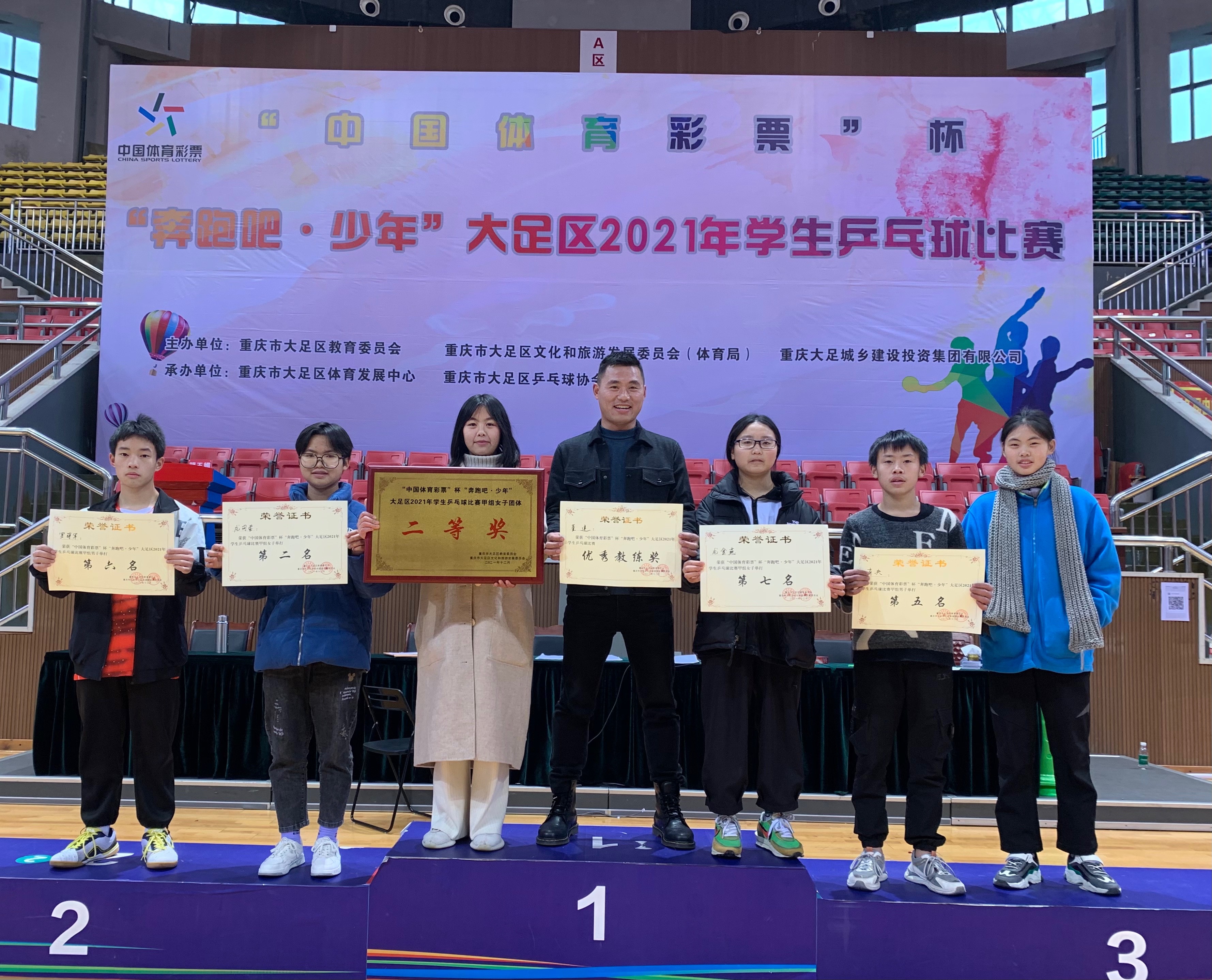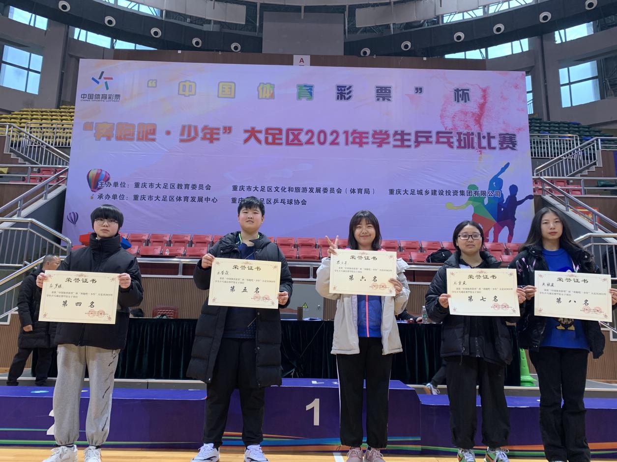 12月17日-19日,职教中心乒乓球校队参加“中国体育彩票”杯“奔跑吧·少年”大足区2021年学生乒乓球比赛勇夺甲组女子团体亚军、甲组女子单打亚军。