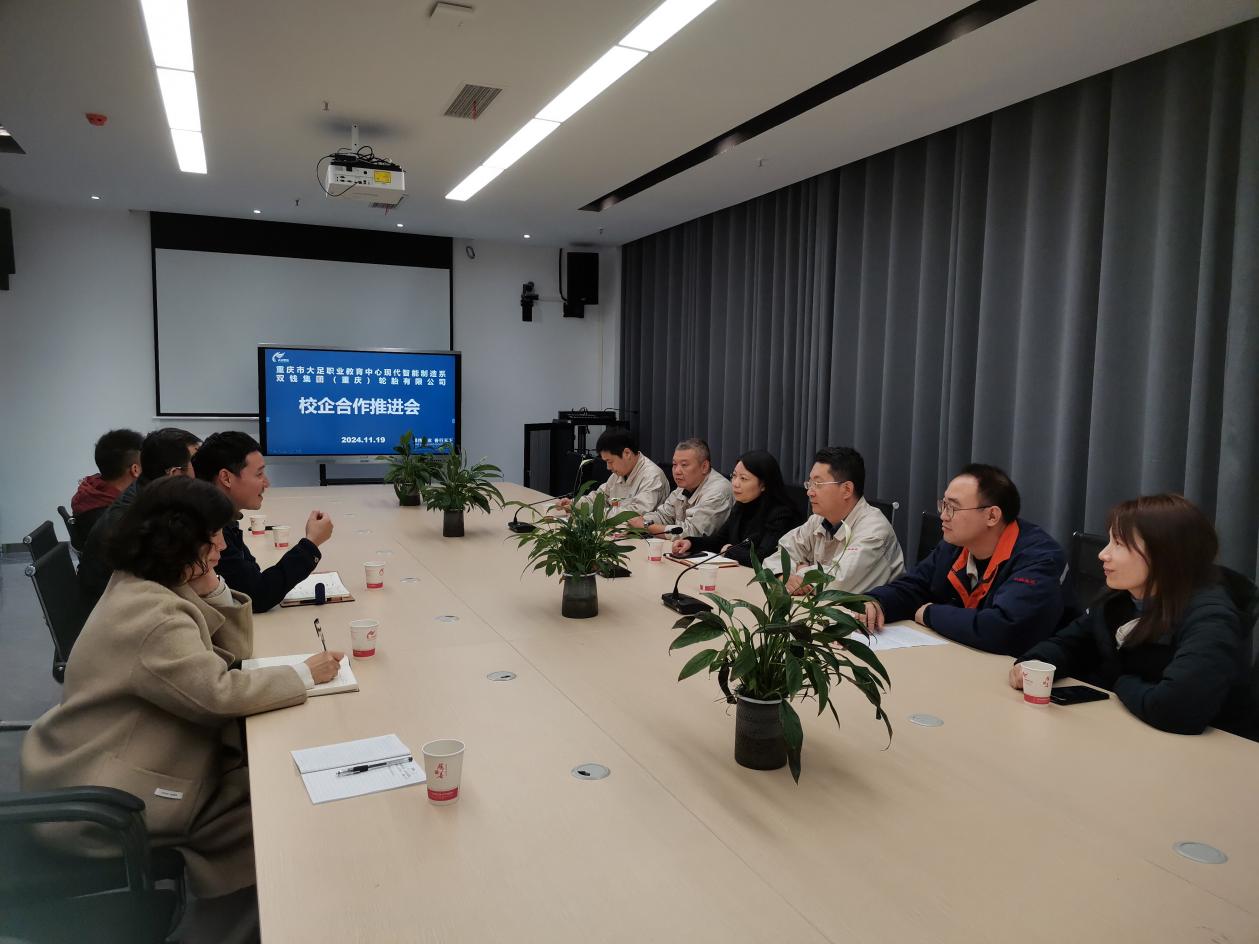 2024年11月19日,双钱集团(重庆)轮胎有限公司到职教中心高新校区现代智能制造系座谈交流,共商推进合作相关事宜。本次交流是继10月25日校企双方初步达成合作意向后的进一步工作推进。参与此次活动的同志有双钱集团(重庆)轮胎有限公司纪委副书记、工会副主席贺小琴,副主任工程师李湘侬、姚洪升,保障一区副主任杨金承,保障二区副主任王帅,人力资源培训主管丁海燕,重庆市大足职教中心现代智能制造系主任刘琦琪,教务处副主任杨巧,专业骨干教师刘武、张雅琪、运凯。
