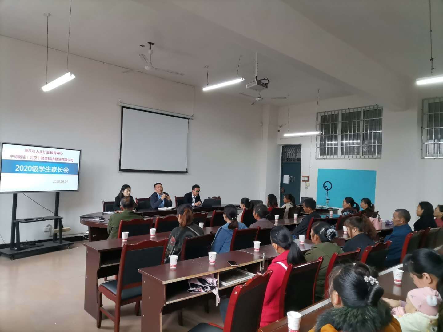 为加强大足职业职业教育中心与中德诺浩(北京)教育科技股份有限公司的深度合作,增强2020级订单班新生及家长对校企合作订单育人的认同感,2020年10月14日,大足职教中心组织召开了2020级中德诺浩高技能订单班家长会暨组织学生开展拓展活动。中德诺浩(北京)教育科技股份有限公司西南区经理余凤娇、助理卜玉彬老师,亲临现场指导并组织开展拓展活动。学校教务处主任、机电工程部部长李再明主持家长会。家长会上,李再明同志为到会的家长详细介绍了校企合作新能源汽车专业订单班的师资团队、专业设施设备、教育教学管理情况。于凤娇同志现场答疑家长对汽车新能源这个专业和学生的就业问题的咨询。通过介绍与答疑,让家长们对校企合作订单育人有了全面、全新的认识;通过与带班班主任的沟通,家长们更加深入的了解了自己孩子在校学习生活情况。家长会后,在汽修专业教师蔡龙的带领下,家长们有序的参观了学校“理、实、虚”一体化新能源汽车专业实训室。在家长参观学校专业实训室的同时,组织订单班学生参加中德诺浩职业素质拓展活动,活动内容新颖别致,让同学们很感兴趣。
