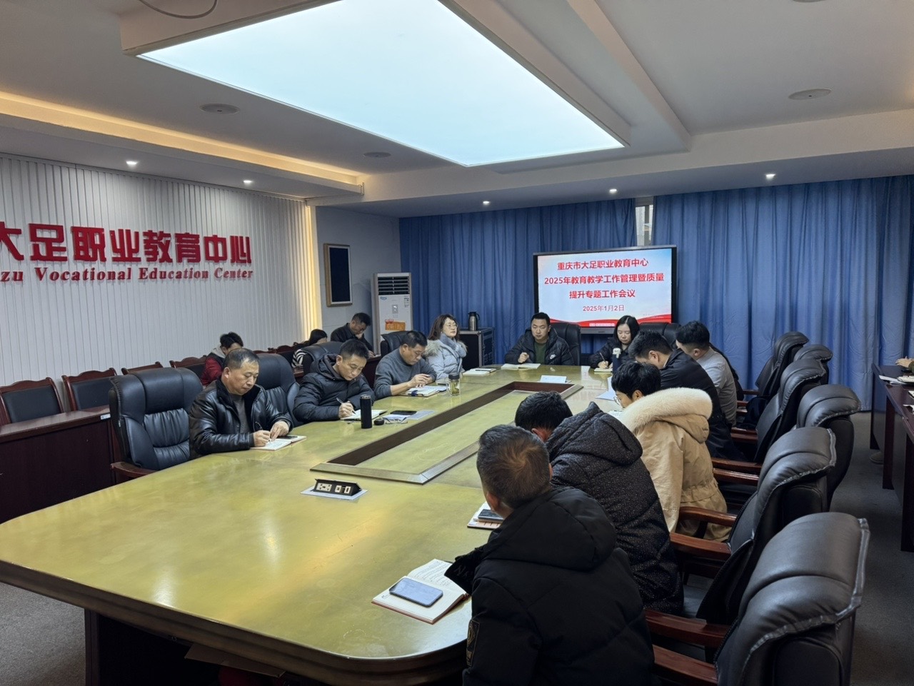 2025年1月2日上午9:00,为进一步推进高水平师资队伍建设,切实提升教育教学质量,重庆市大足职业教育中心2025年教育教学工作管理暨质量提升专题工作会议在海棠校区励志楼二楼会议室召开。职教中心党委书记杨朝均,党委副书记、校长封吉泉,专职副书记胡广强、副校长李再明、彭冬梅、甘雨,教务处主任李波、教科处主任邓川、现代智能制造系主任刘琦琪、高考部主任钟世娟、现代教育服务系主任李海燕、现代信息技术系主任邹汝全,以及全体教研组组长、各系部教学管理人员参会。