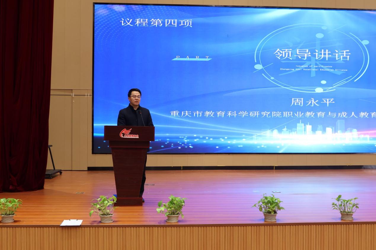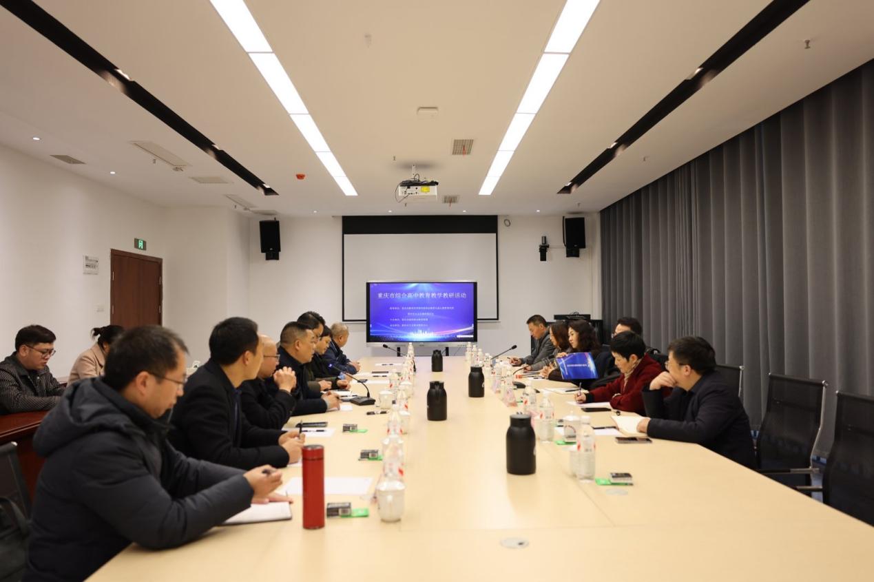 三是专家指导。重庆市教科院周永平同志作指导讲话。讲话强调 “综合高中需打破职普教育壁垒,构建‘文化基础 + 职业技能 + 综合素质’的三位一体课程体系”,并从课程融合、教学模式创新、评价体系优化等方面提出 3 点具体实施建议,为联盟校开展相关工作提供了实操性思路与专业指导。