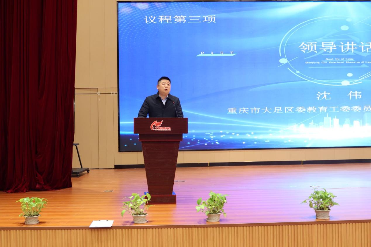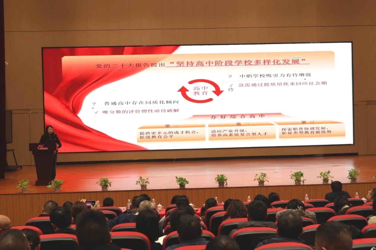 二是领导讲话。沈伟同志代表大足区教委发表讲话。讲话指出,综合高中是衔接职业教育与普通教育的重要载体,对优化教育结构、满足学生多元发展需求具有关键意义。各学校要立足区域产业发展与学生成长需求,深化教育教学改革,加强师资队伍建设,完善课程体系构建,推动综合高中教育提质增效,为地方培养更多高素质复合型人才。